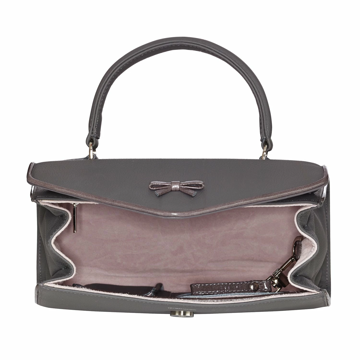 - Grey patent piping with a hint of aubergine and signature bow detail
