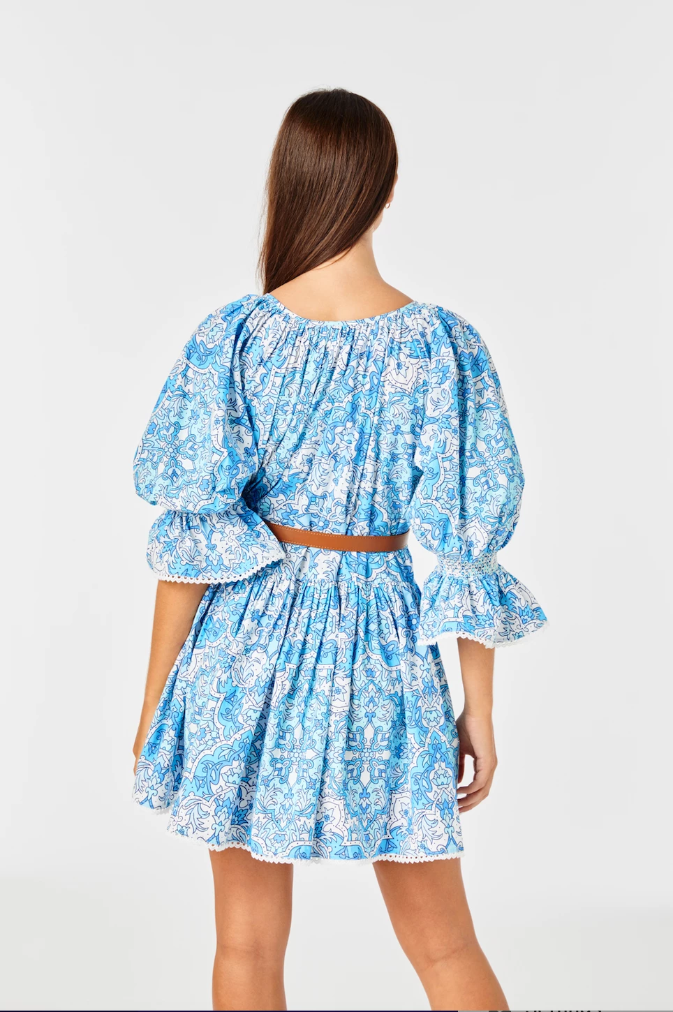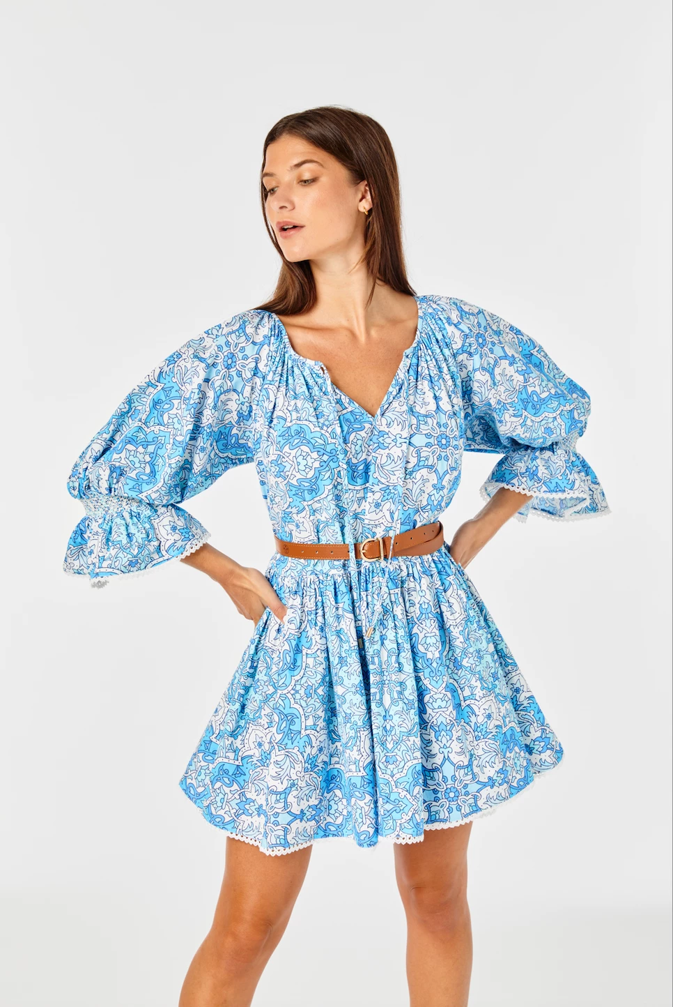 The Ana is a Trapeze silhouette in our spring Moroccan Tile print, inspired by our travels to Marrakech. This dress has a shirred neckline, tiered hem, and eyelet trim on the sleeves and hem of the dress. The puff sleeve has smocking with contrast embroidery. Comes with a custom vegan leather belt.