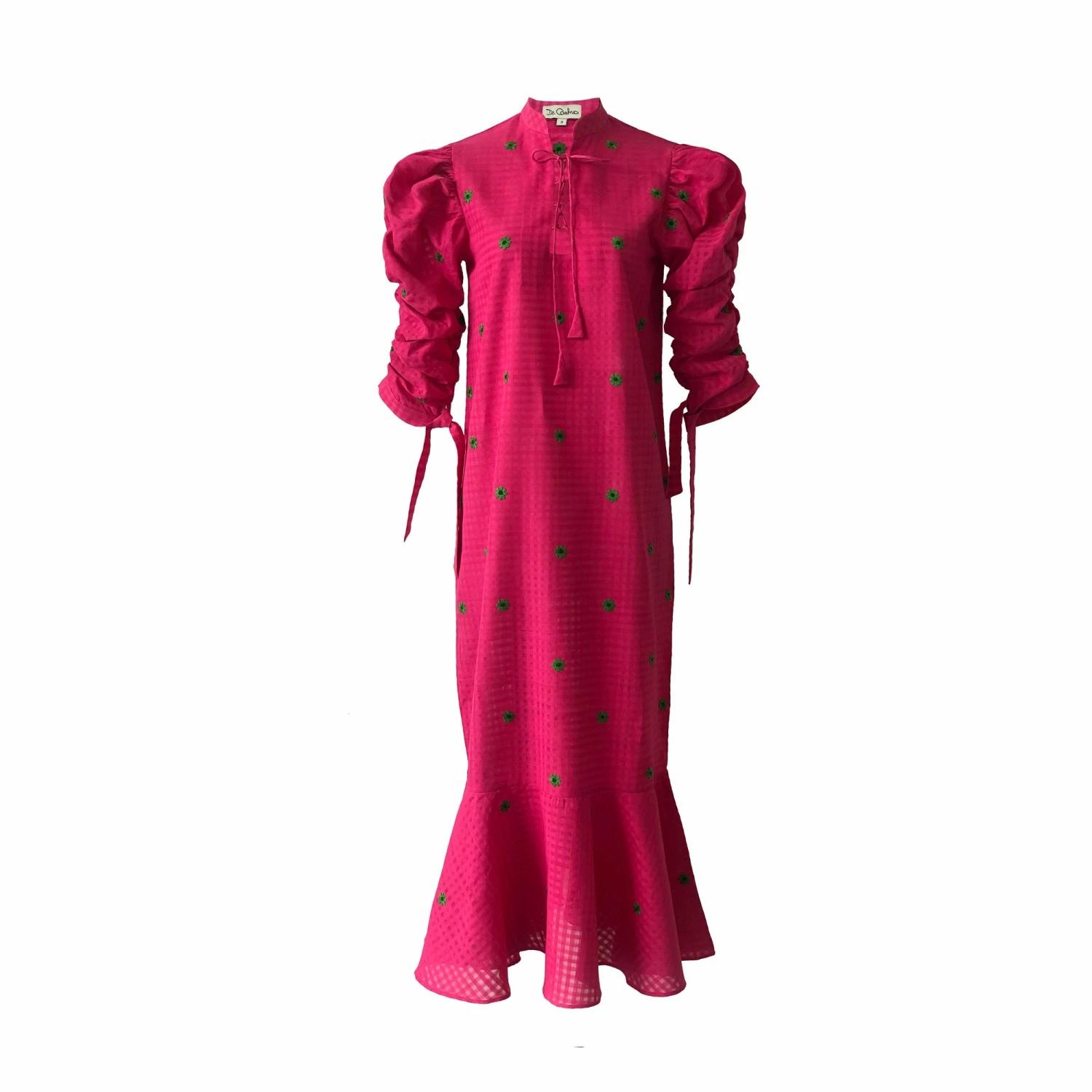 The Barbie Margarita Dress is made in pure Khadi handloom cotton. It features green hand-embroidered flowers, gathered puff sleeves and wide ruffle hem.