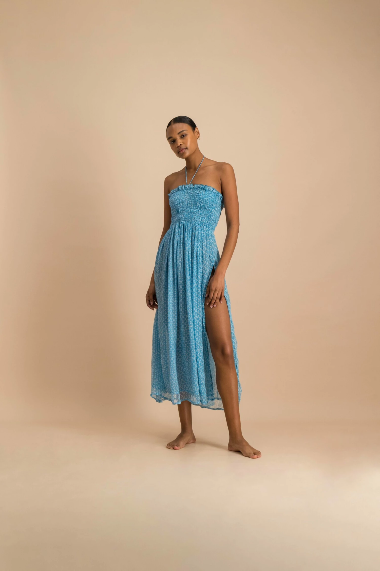 A real multi-wear piece: because versatility is everything. Can be styled any which way: as a midi dress or maxi skirt, with or without the delicate cord tied around the neck. Feminine and easy-wearing with a subtle knee-high split and stretch-smocked bodice, finished with a pretty frill.
