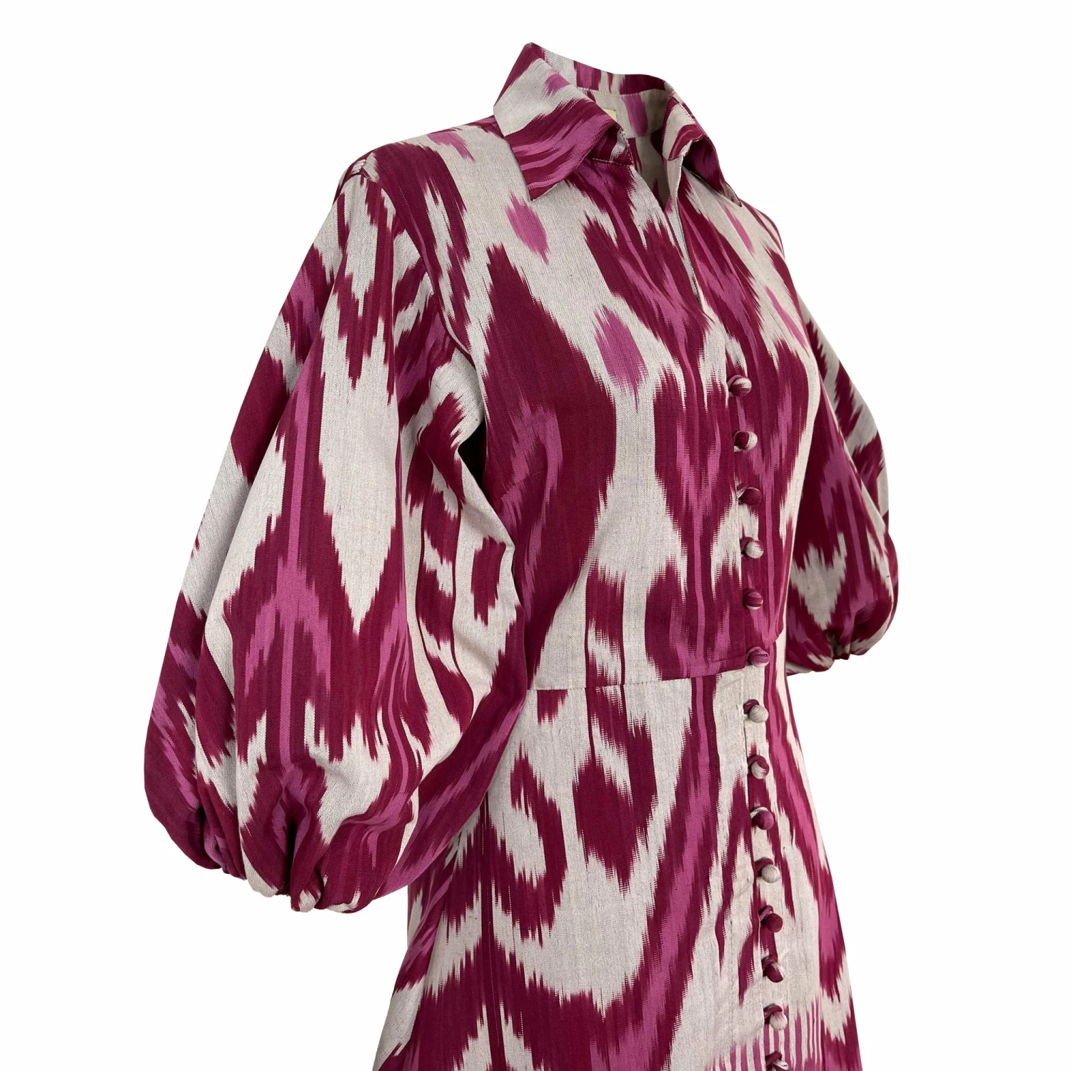 This new version of the Jodhpur dress it is made out of beige, pink and burgundy handwoven silk Ikat. It features fitted body, collared neckline and ballon sleeves.