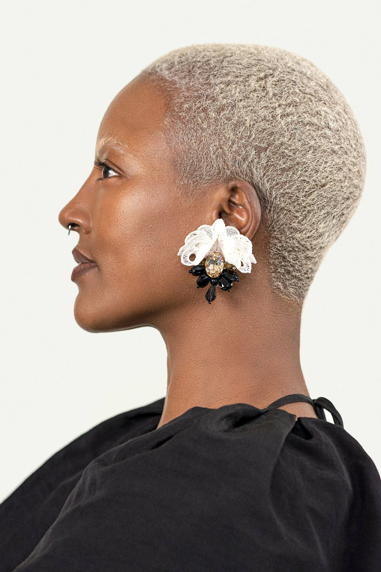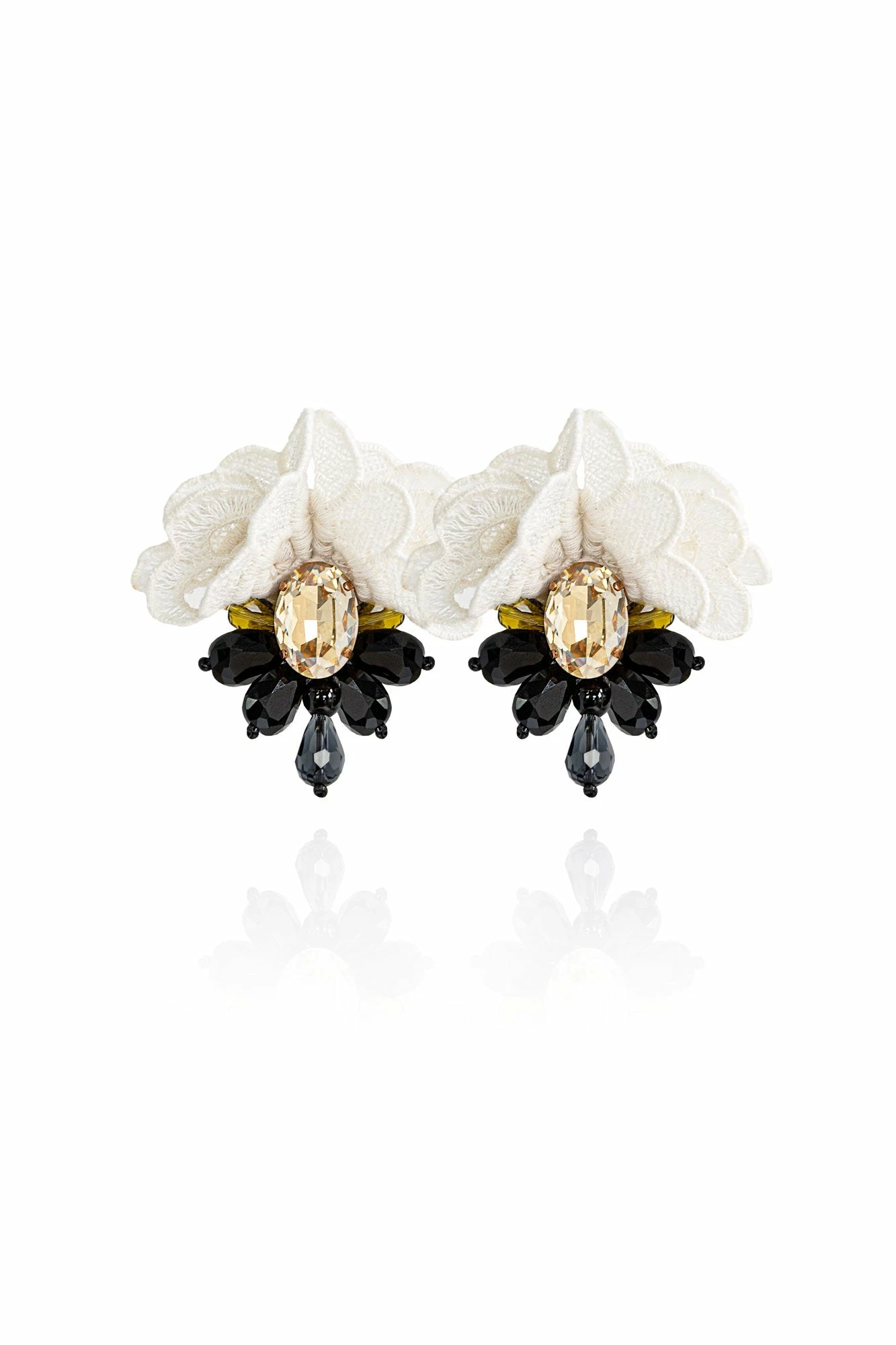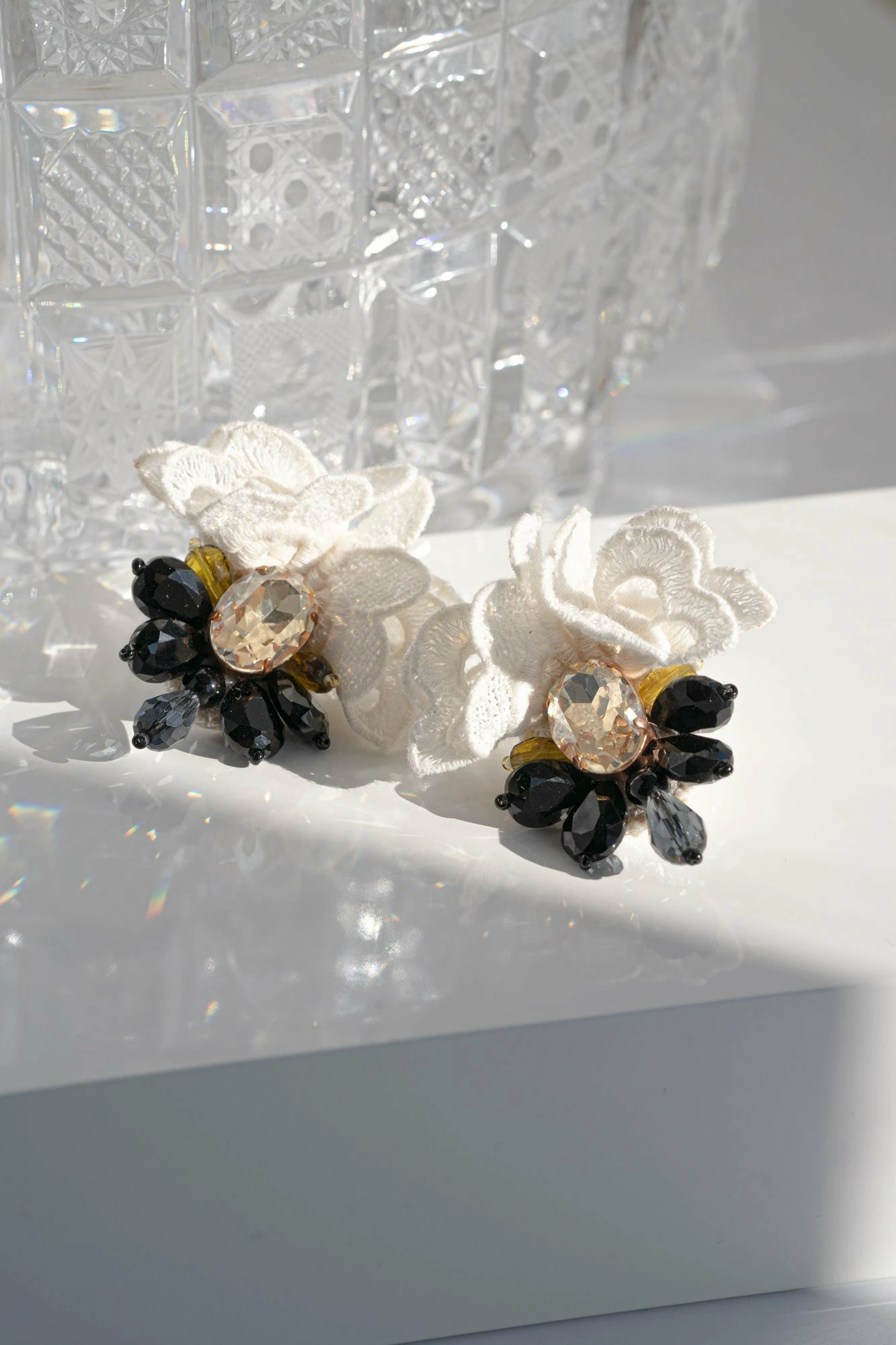 Carmen Clip On Earrings are dimensional wonders, balancing delicate lace textures with sleek, shining beads. An oval-shaped crystal rivoli center offers endless facets for light refraction, while a symmetrical arrangement of Czech glass beads dangle elegantly below. A spray of soft white floral lace sits atop, like champagne foam bubbling over the bottle. Carmen Clip On Earrings are absolutely effervescent—perfect for the woman who always has something to celebrate.