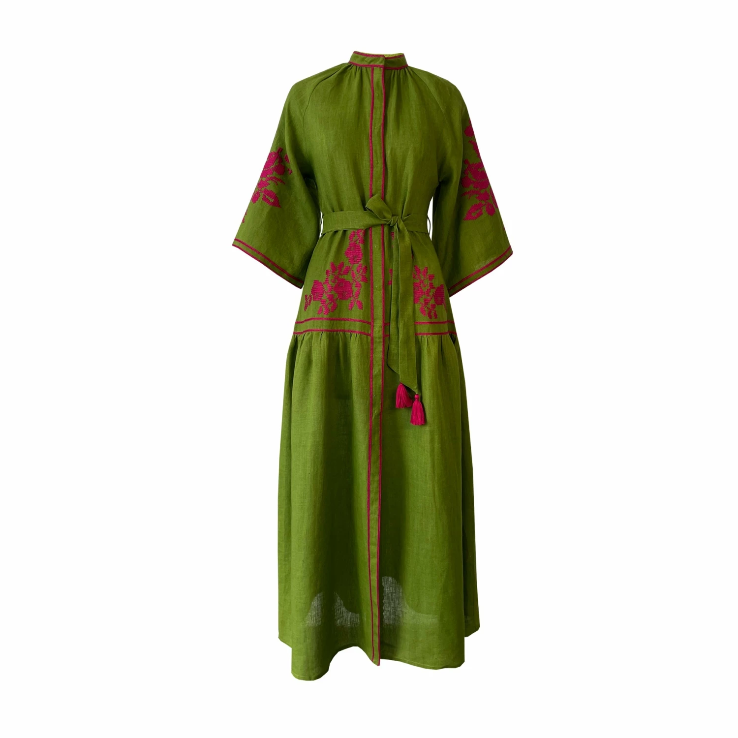 The Cranberry Dress is made in juicy green linen from the South of India. It features contrasting pink embroidery, hidden front buttons, bell shaped raglan sleeves and tasseled belt.
