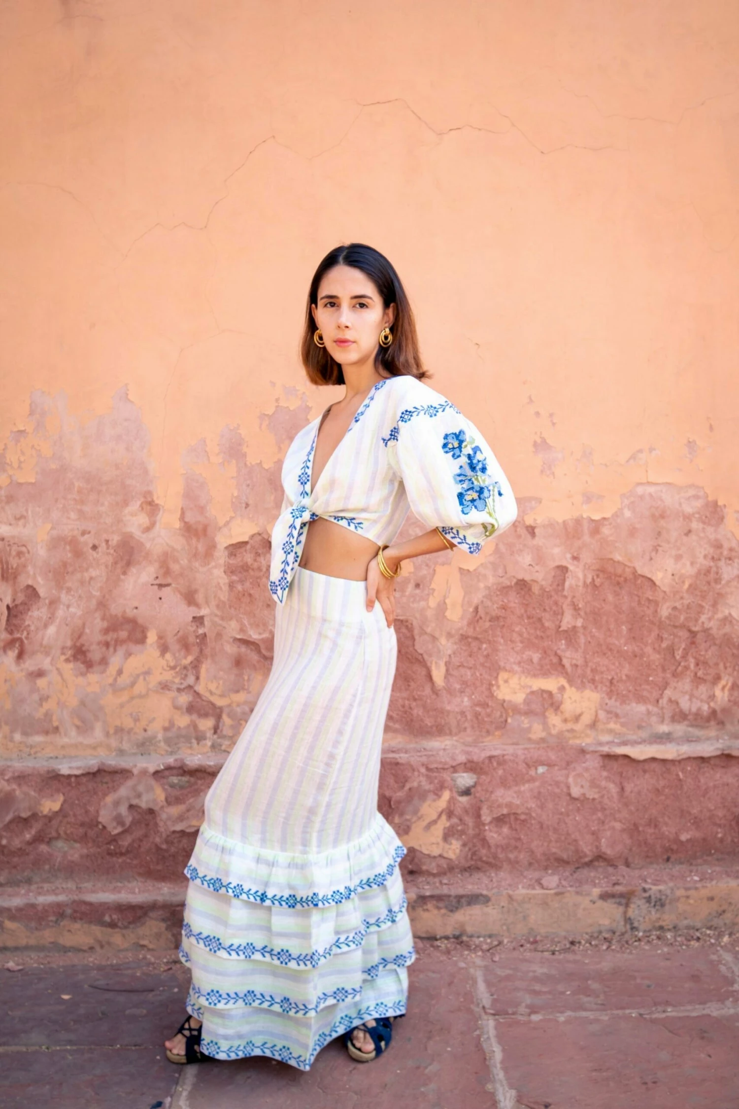 The Chicory skirt is made of handloom stripe linen from the South of India.