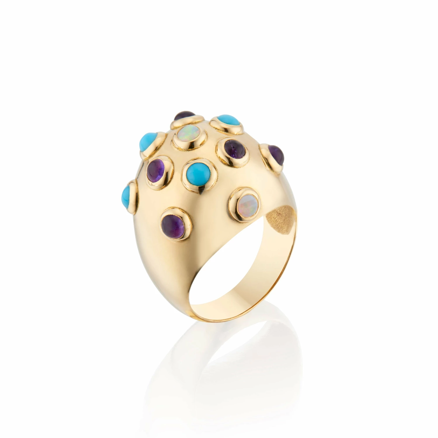 From The Classics Collection, this 18K yellow gold Deco Dome ring features opal, amethyst and turquoise bezel set gemstones.