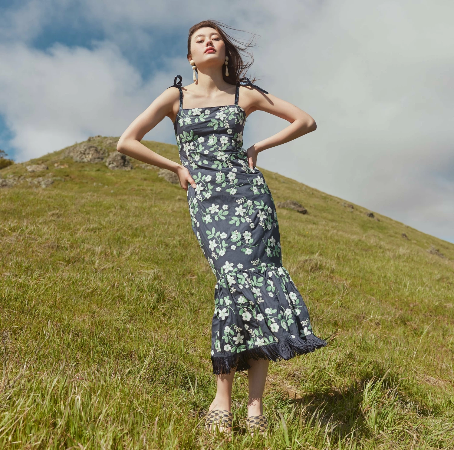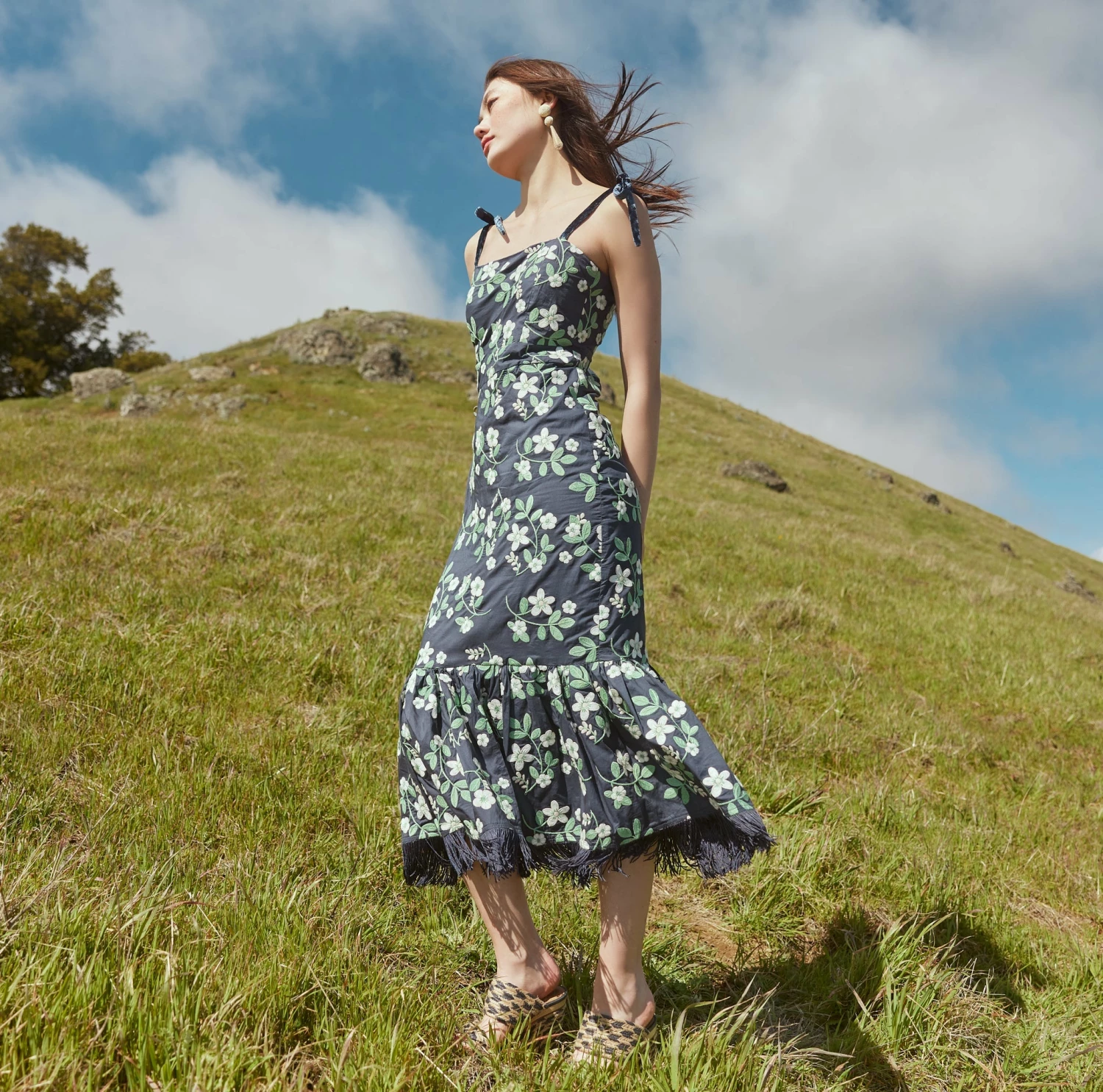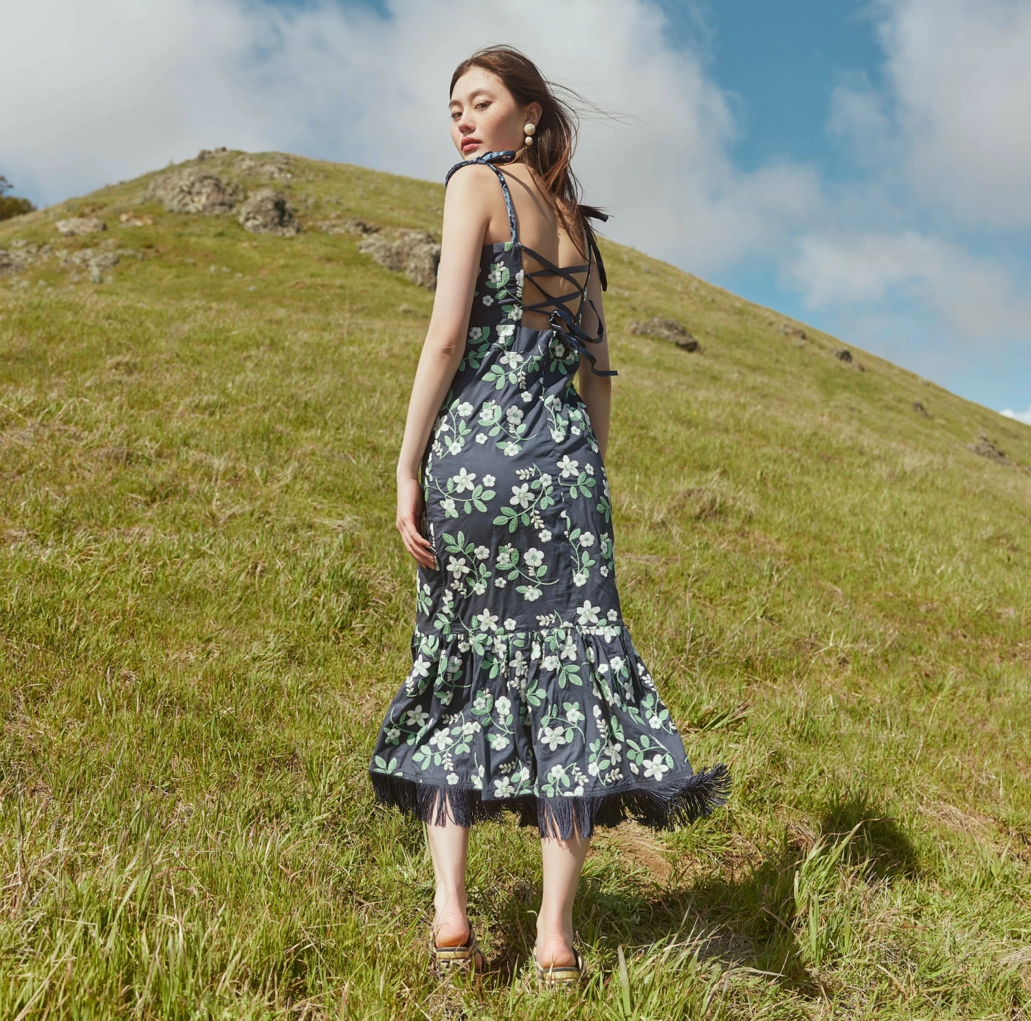 This midi dress embodies garden goddess. Satin ribbon corset details at the back provide a beautiful juxtaposition to the fun fringe that dances on the hem. Allover multicolored floral embroidery makes this piece eye-catching and special. It is finished with velvet ties at the shoulder for that romantic touch