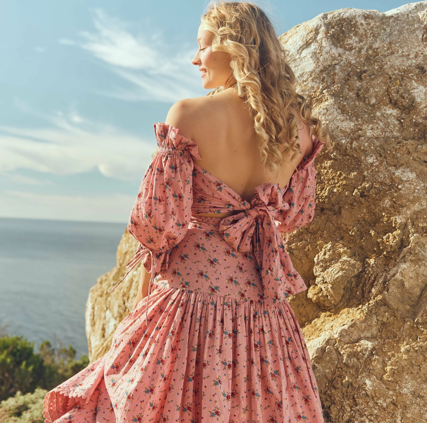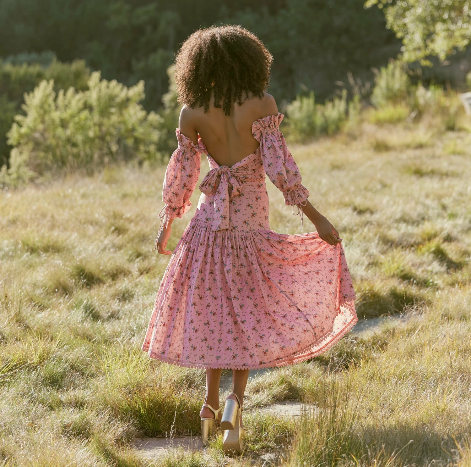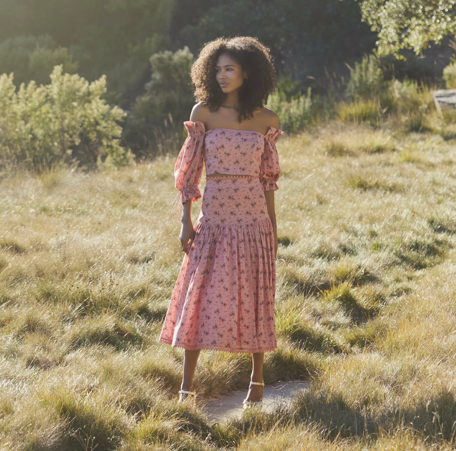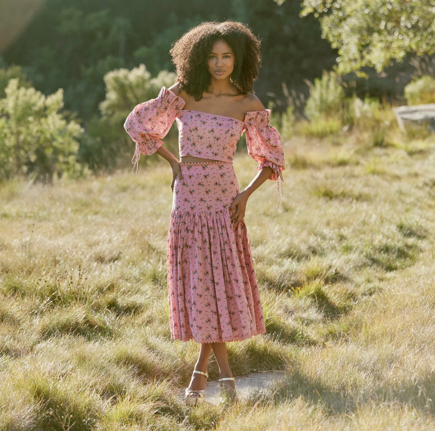 With beautiful lace details at the top waist and bottom edge, this drop-waisted full midi skirt lends a fresh, modern feel to a timeless silhouette. Pair with the Victoria Embroidered Top for a beautiful kissing lace detail at your waist, or outfit more casually with a white tank. To add to the whimsy, this skirt has touches of intricately woven gold lurex that add a sparkle, glistening in the sunlight