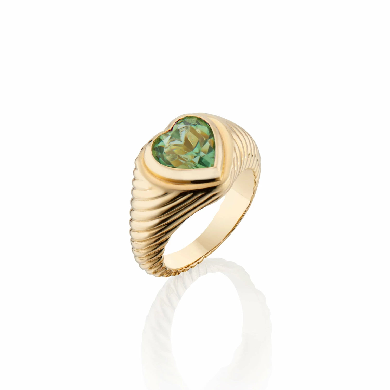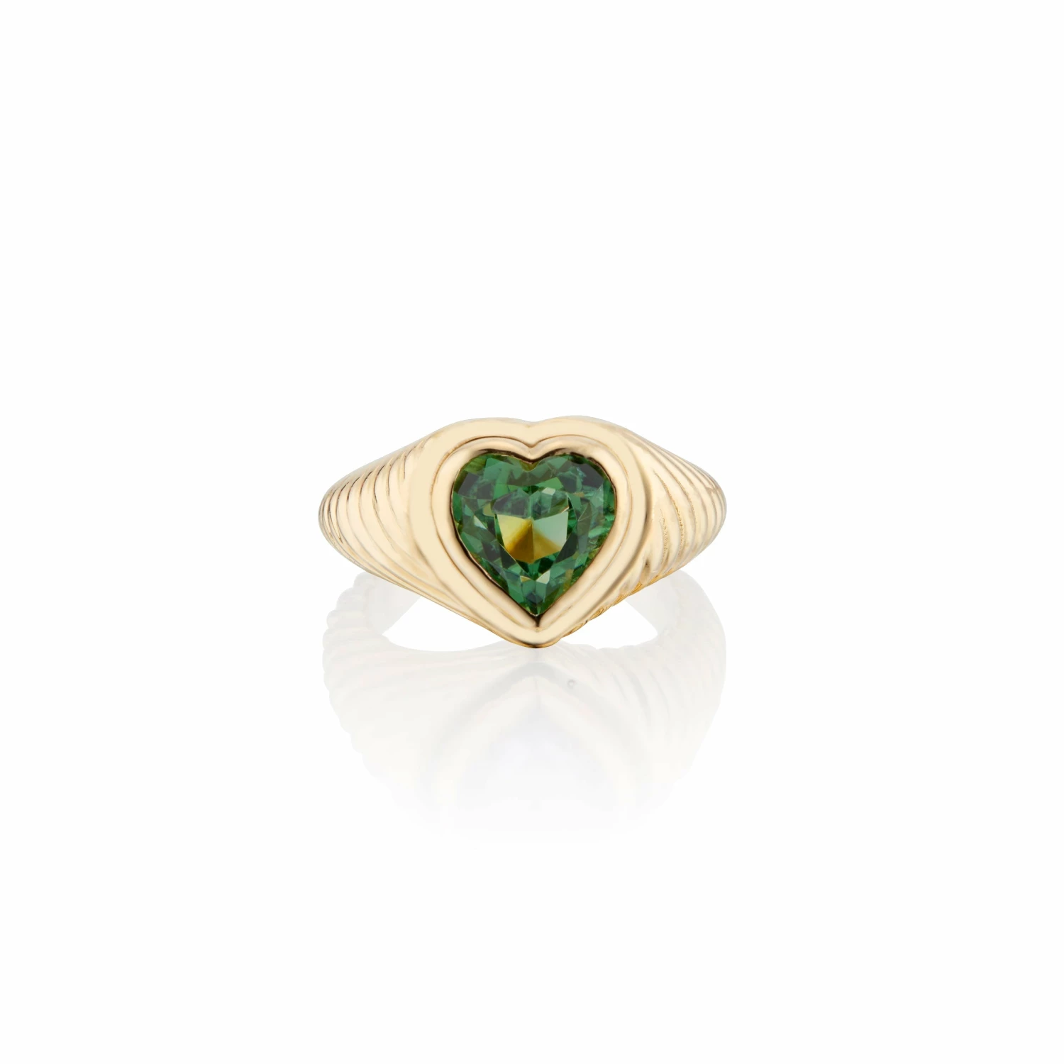 From the Eden Collection, an 18K yellow gold bezel set signet pinky ring with a beautiful hand carved heart green tourmaline gemstone. Named for the healing coiled snakes in Greek mythology’s Eden, this piece represents protection, immortality and rebirth.