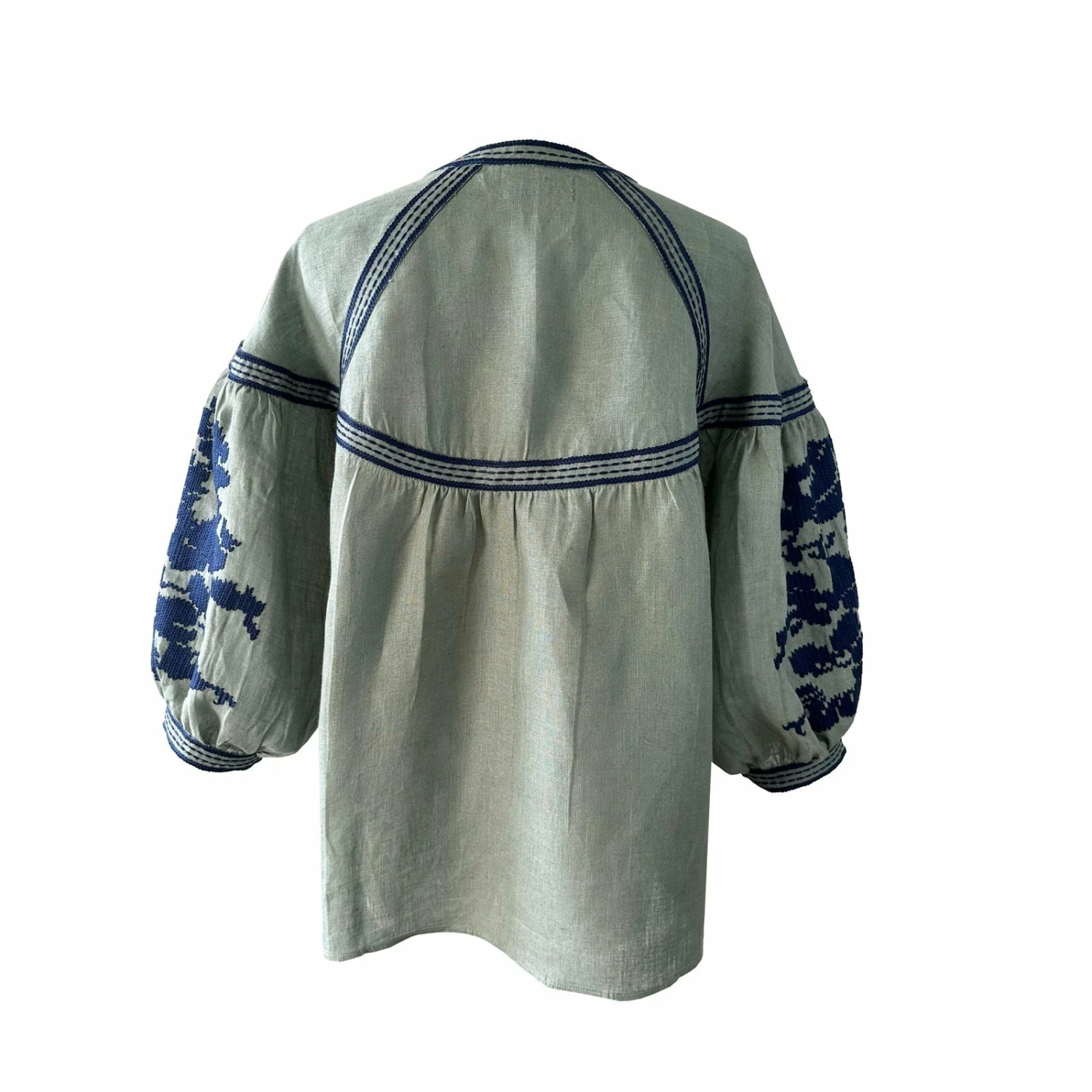 The Green Blouse is made of crisp green linen from the South of India. It features hidden front buttons, puff sleeves and hand-embroidered blue floral motifs.