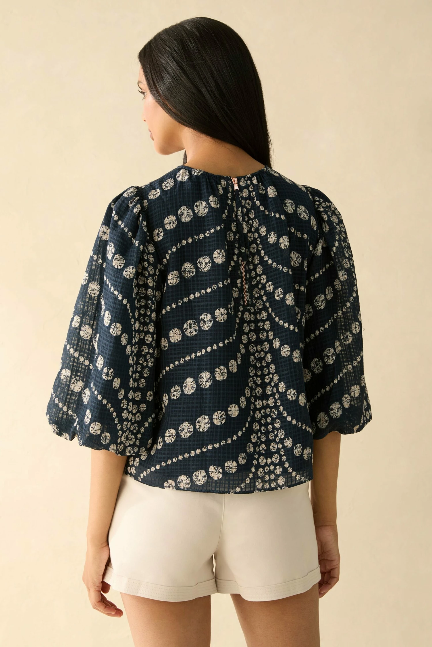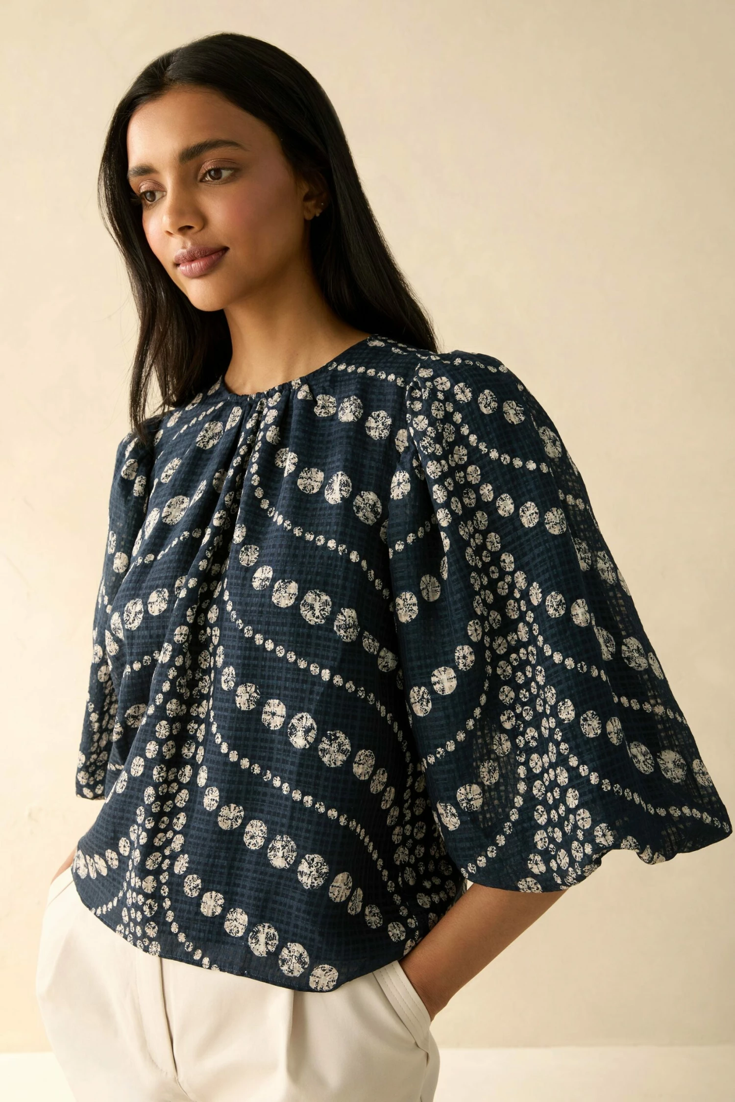 This simple but flattering silhouette with statement sleeves and expert tailoring pairs just as well with denim as she does with a dressier option like our Eryn Short in Lavender Gary. Pictured here in our new global-inspired Dolphine print, the Harly Top can be worn tucked or untucked.
