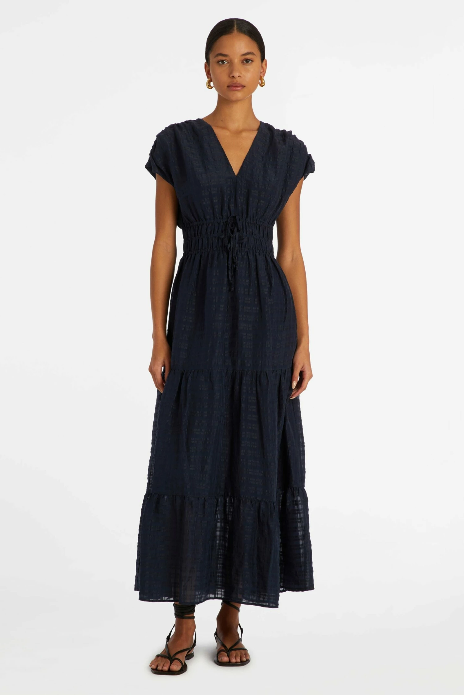 In our Sapphire solid, Indy is a wardrobe workhorse that will take you from peak summer straight through fall when paired with the right layers and footwear. The midi-length dress’ elastic waist, subtle cap sleeves, tiered skirt, and soft textured fabric features all the style hallmarks of a Marie Oliver classic.