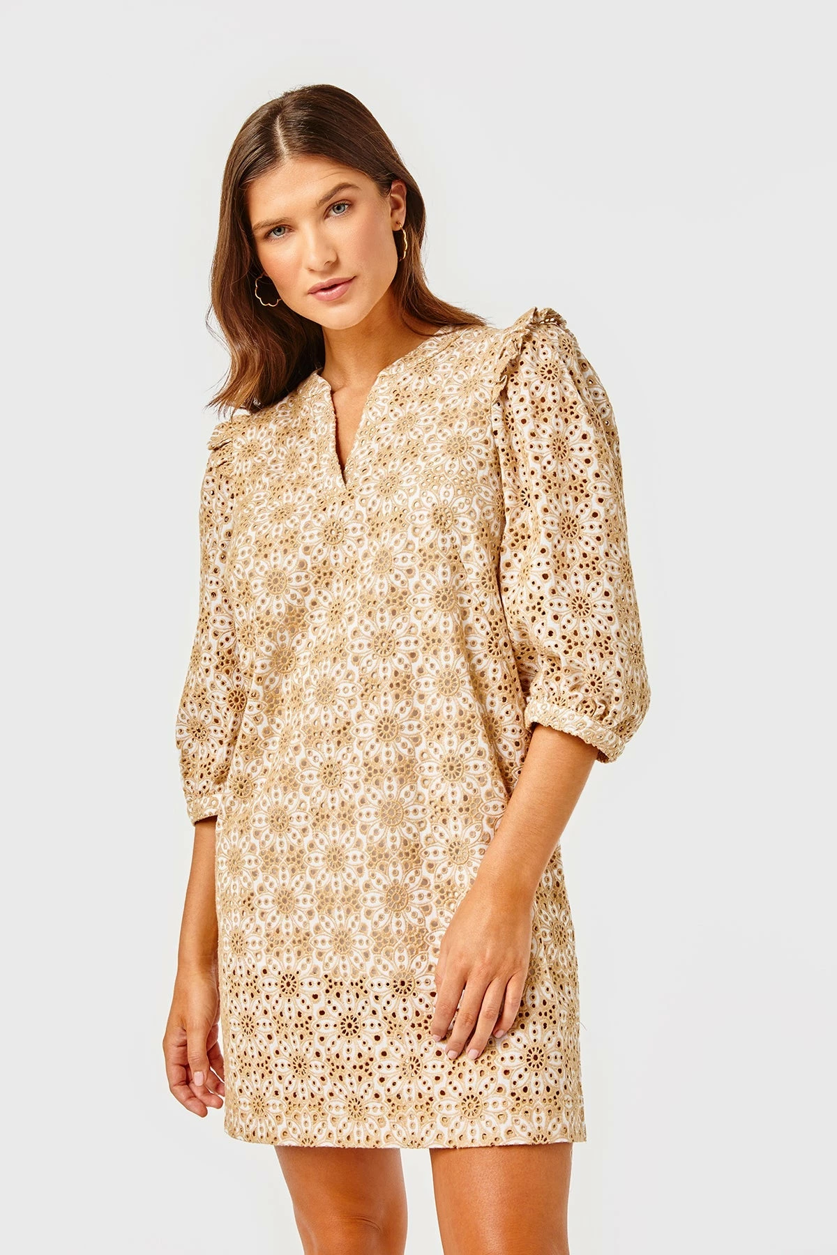 The Isabella dress is a comfortable shift silhouette inspired by the eternally chic Brigitte Bardot. Our new 2-color custom eyelet cotton embroidery fabric is influenced by the artisans of Portugal. Features a feminine blouson sleeve with a ruffle on each shoulder and a button cuff opening. Side seam pockets and side vents offer a relaxed fit. Designed and sewn in Los Angeles.