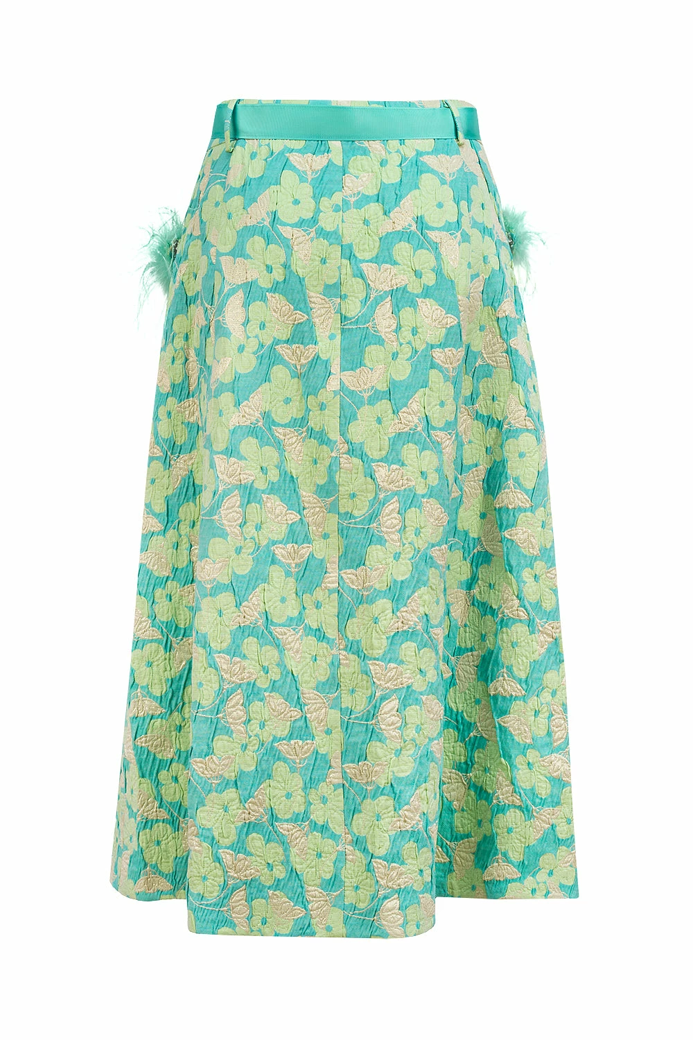 Mint Skirt With Feather Details is cut from a lightweight cotton with a hint of stretch. The skirt has feather details on the front and pearl buttons on the front. Style yours with a Mint Handmade Knit Top and a pair of mules.