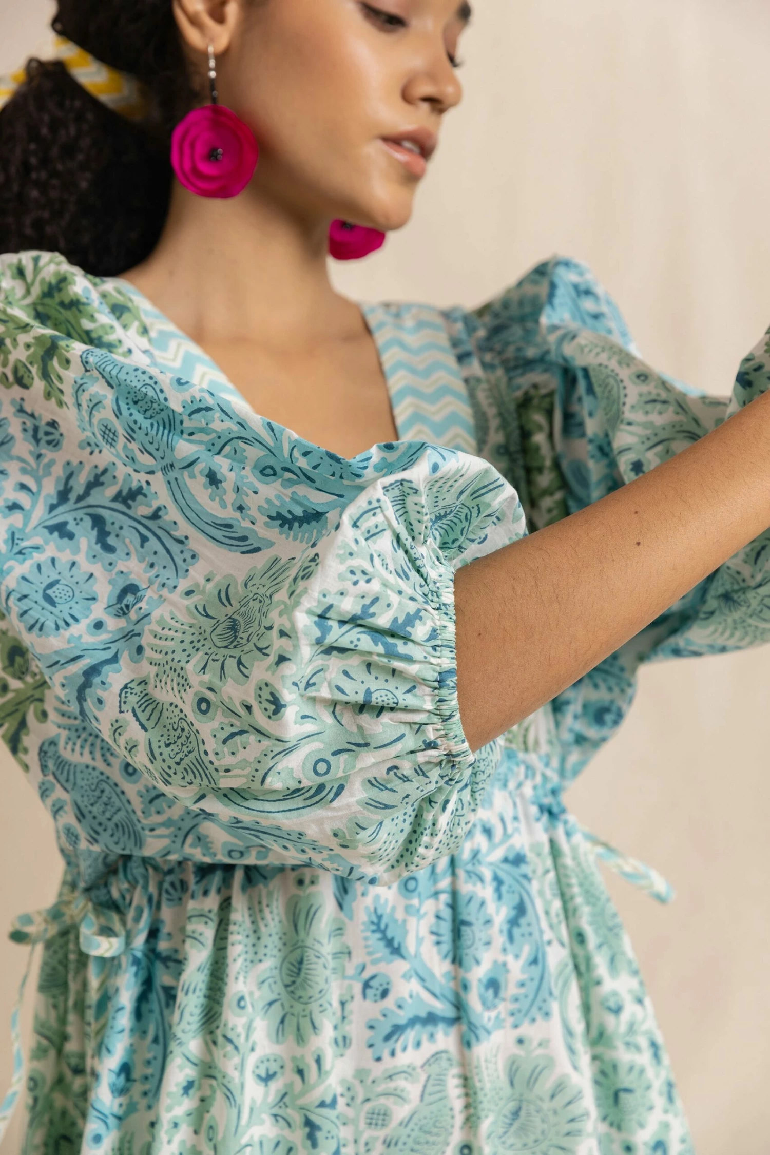 The Jaime is stitched in soft block-printed cambric cotton and looks like a beautiful tent, until you pull the magic drawstrings under the bust to give as much shape as your require.