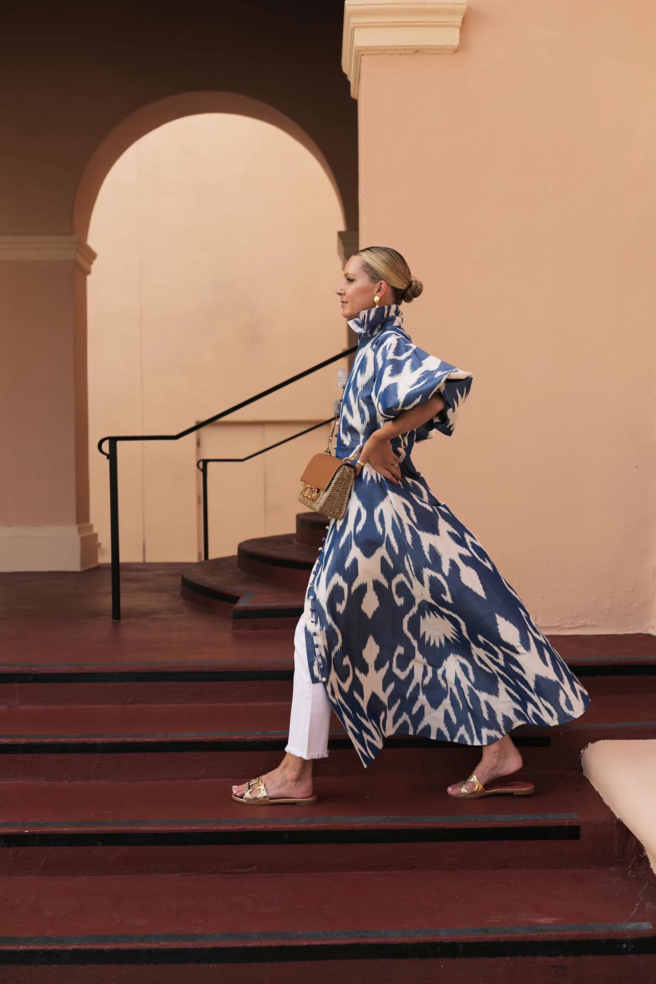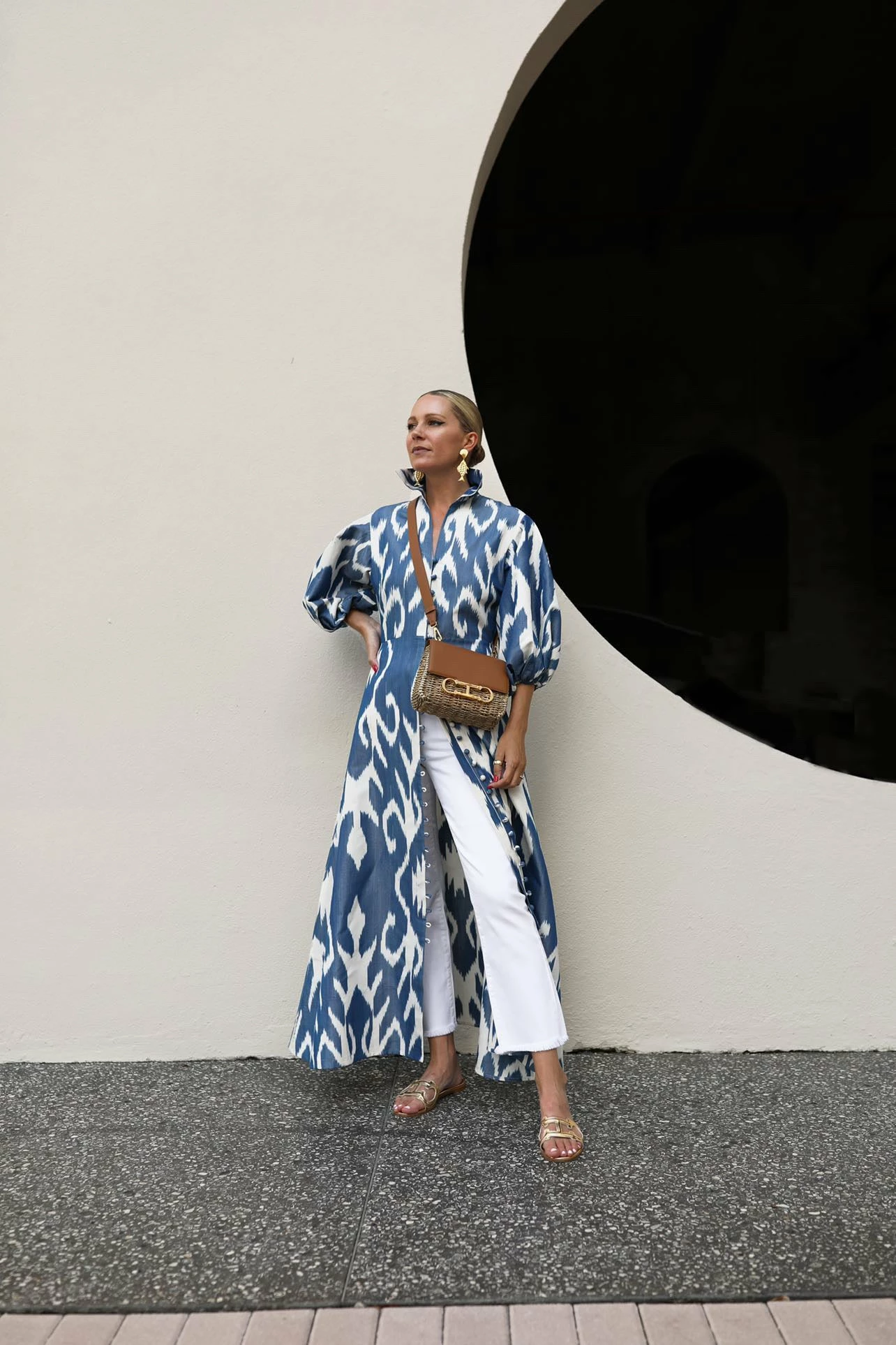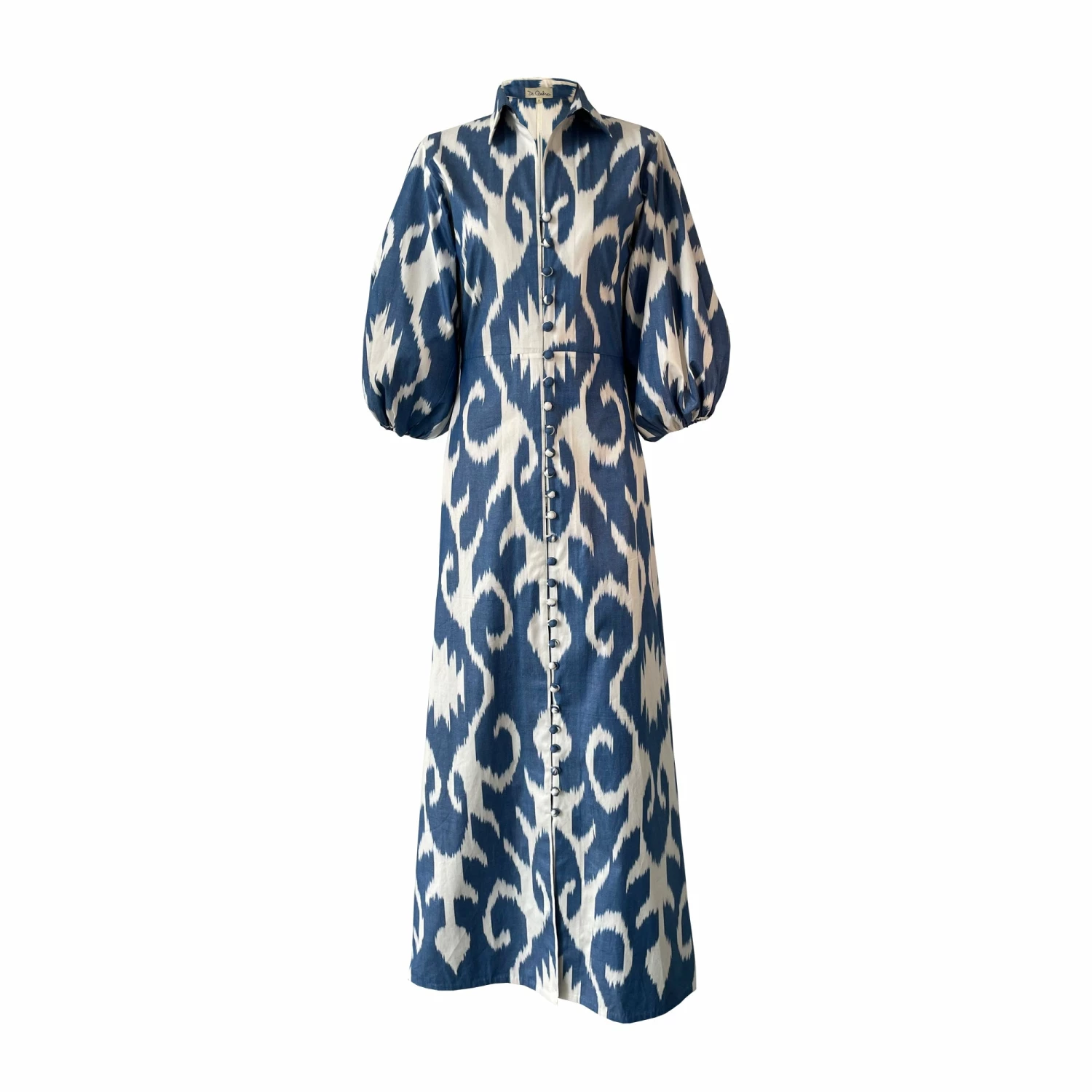 This white and blue dress is made from handwoven silk in the south of India. Fitted, collared neckline, ballon sleeves. Â