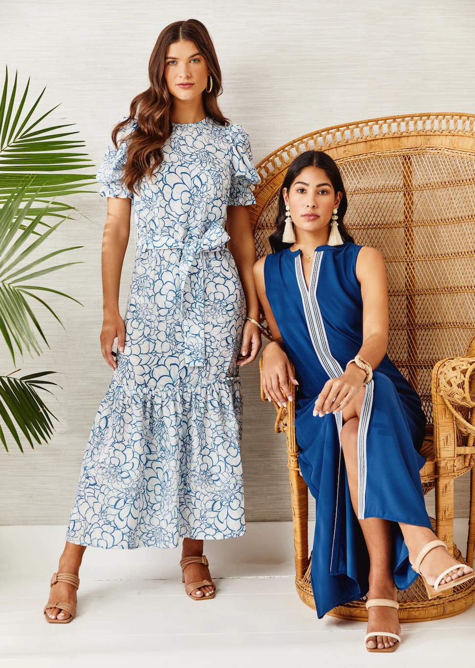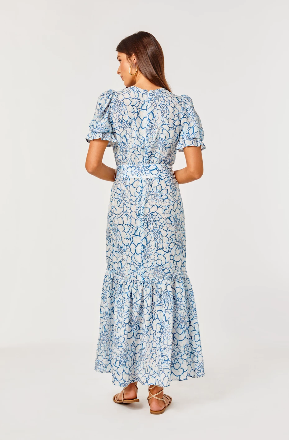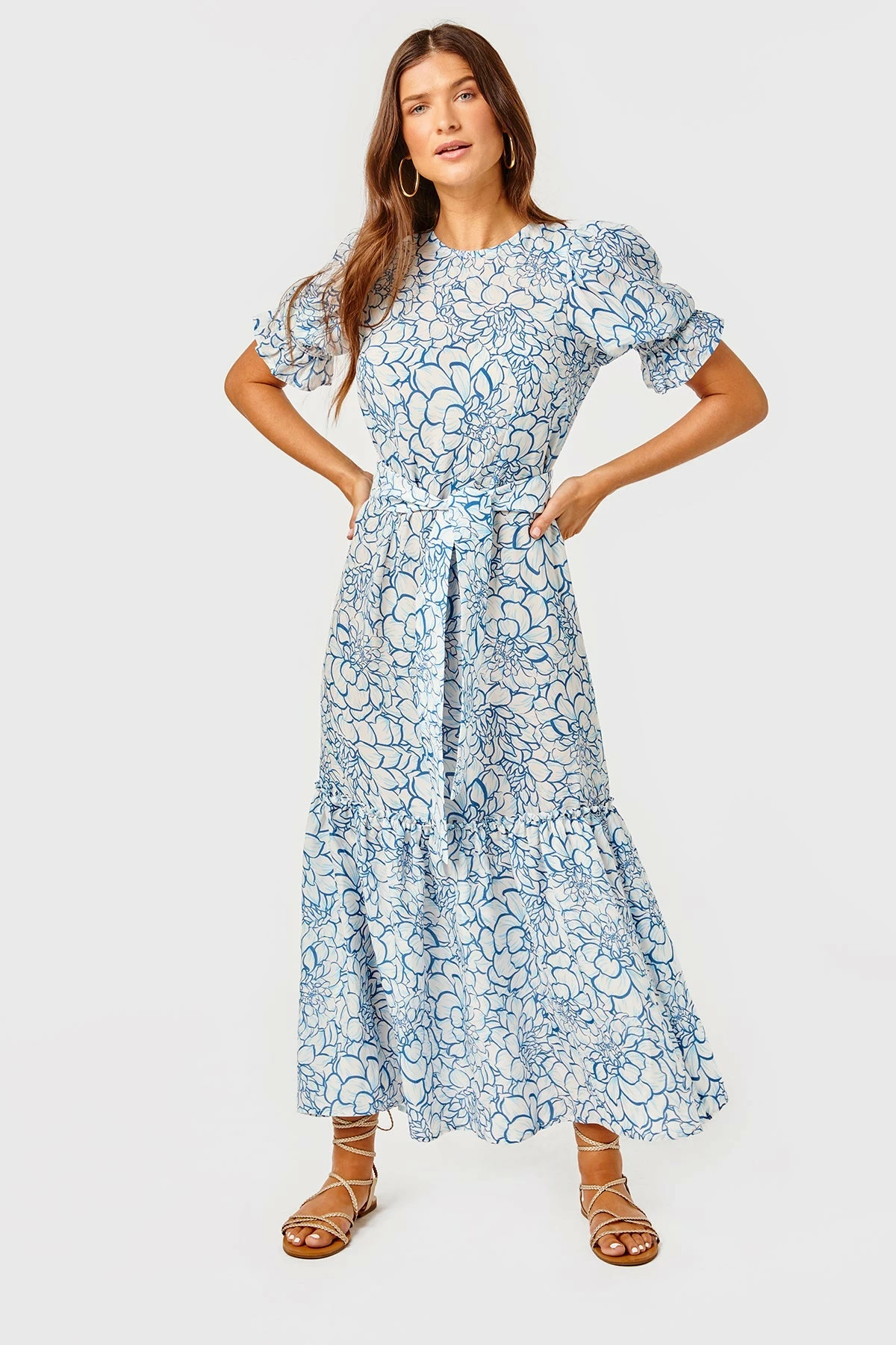 Inspired by the long, beautiful beaches of Comporta Portugal, our Comporta print is printed on 100% cupro, a sustainable fabric that feels like silk. The Khaki maxi dress is fitted with a puff elastic sleeve and an invisible back zipper. In addition, we added a drop ruffle hem detail. Designed and sewn in Los Angeles.