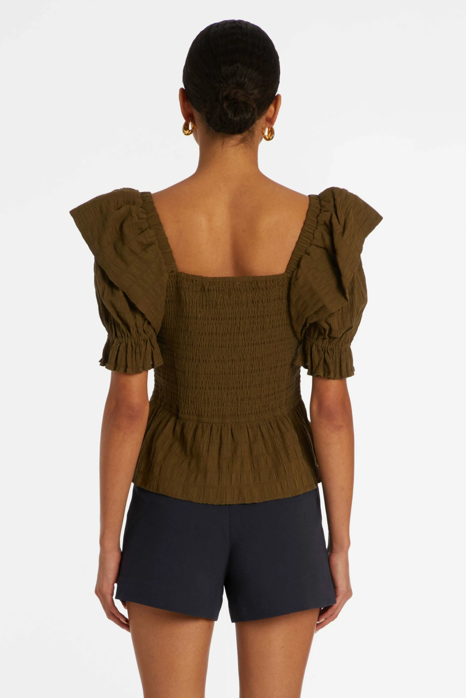 Sassy meets sweet in our new Lala Top, which features dramatic sleeves, a square neck, smocked bodice, and gentle peplum flounce. Coming in a transitional Juniper green hue this season, the mossy color extends the wearability of this textured tone-on-tone seersucker top well into fall.