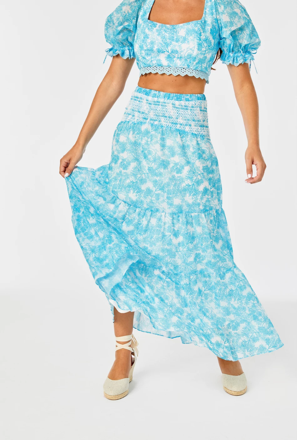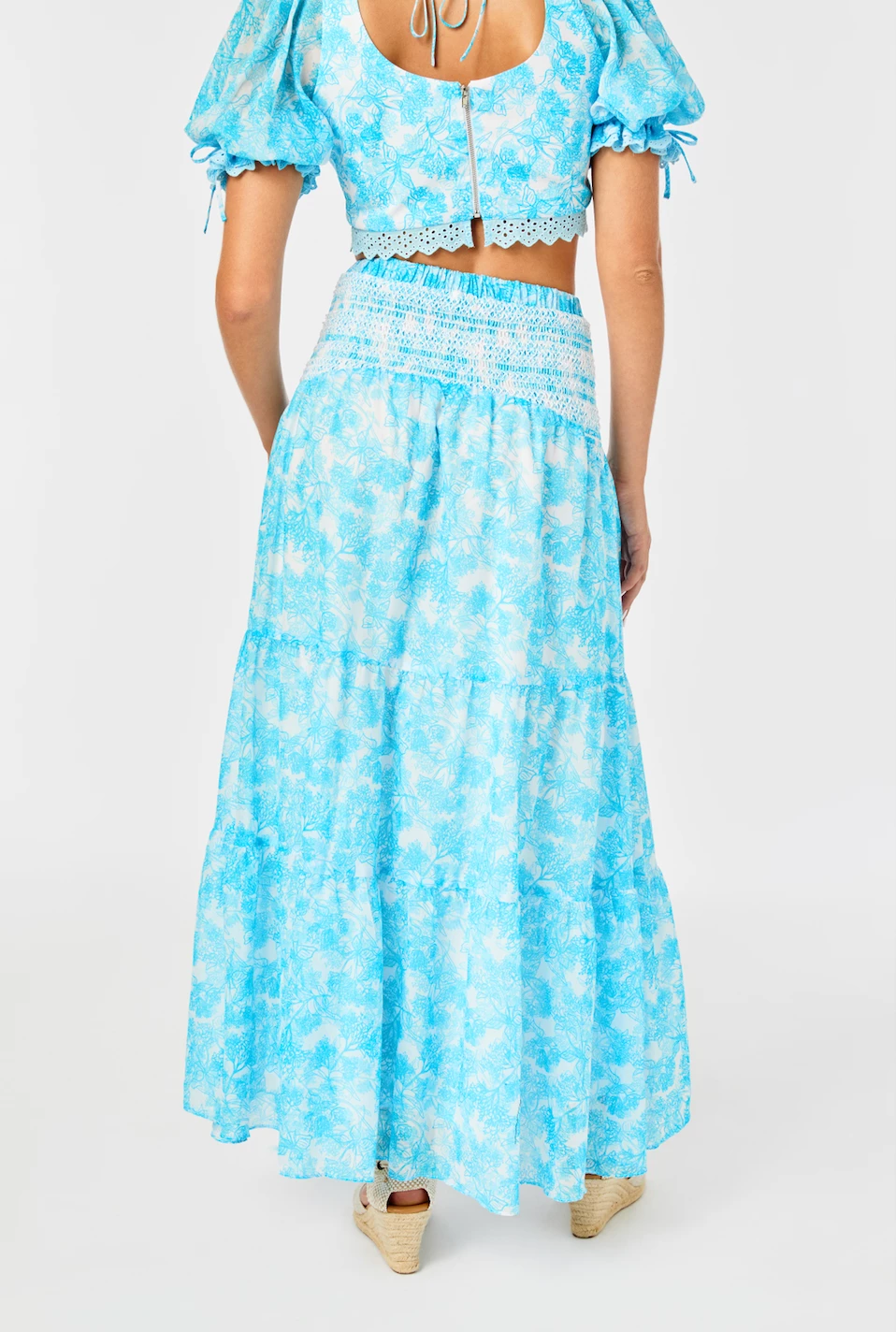 The ‘Wild Marjoram’ print was hand drawn by Lauren Bell, who collaborated with us on this look. Our Le Bell is a tiered maxi skirt in sheer voile with lining. Comfortable smocked waistband and pockets. Designed, smocked, sewn, and printed in Los Angeles.