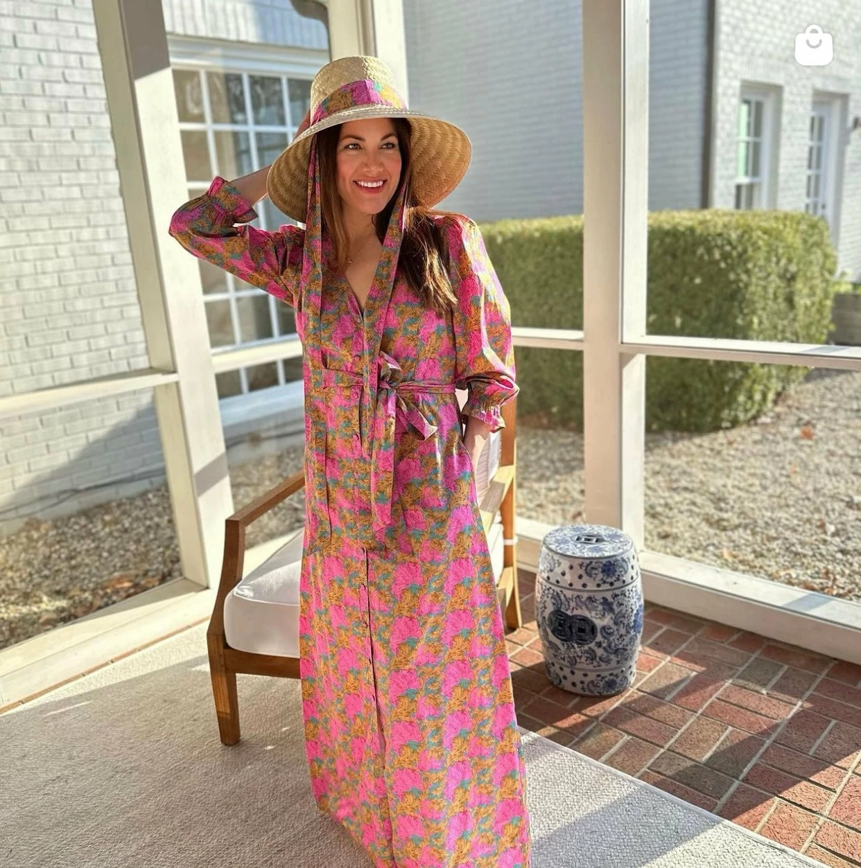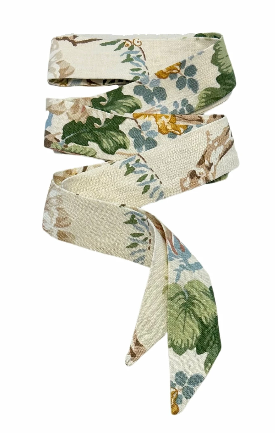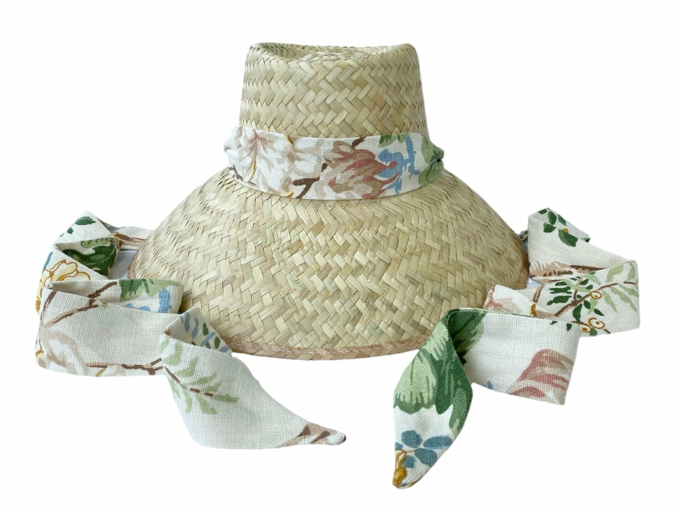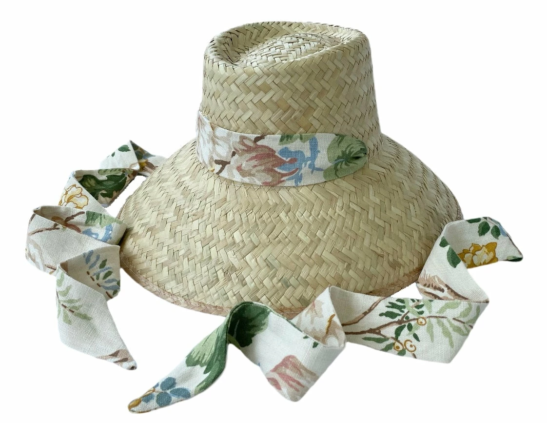 This sun hat ships with a Lee Jofa x Sarah Bray Bermuda ribbon beautifully sewn from
