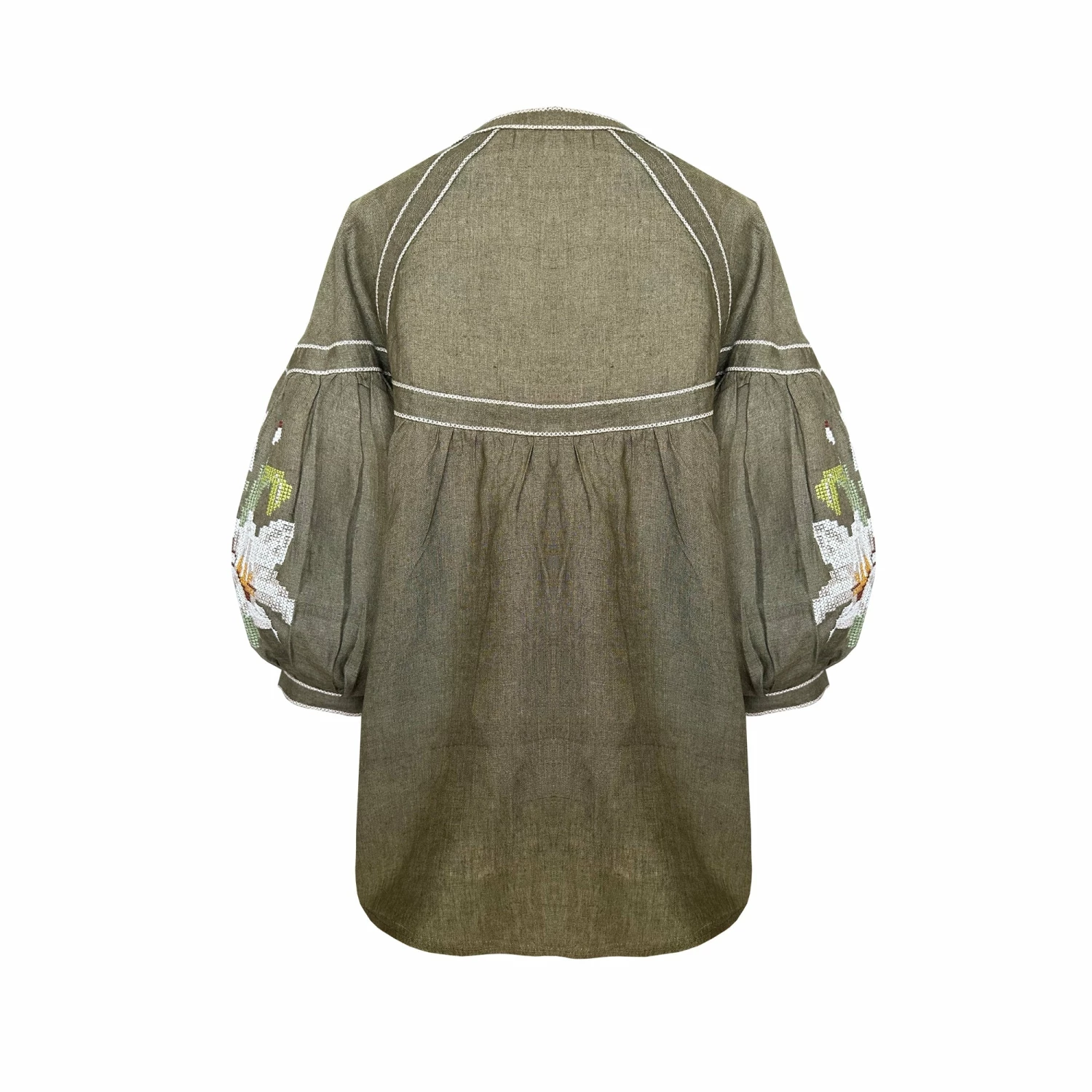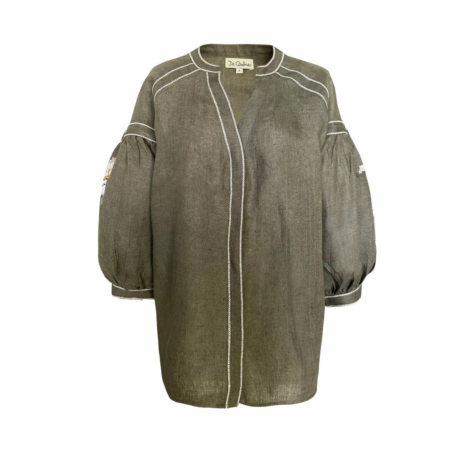 The Lilies Blouse is made of crisp military green linen from the South of India and it features hidden front buttons, puff sleeves and machine-embroidered floral motifs.