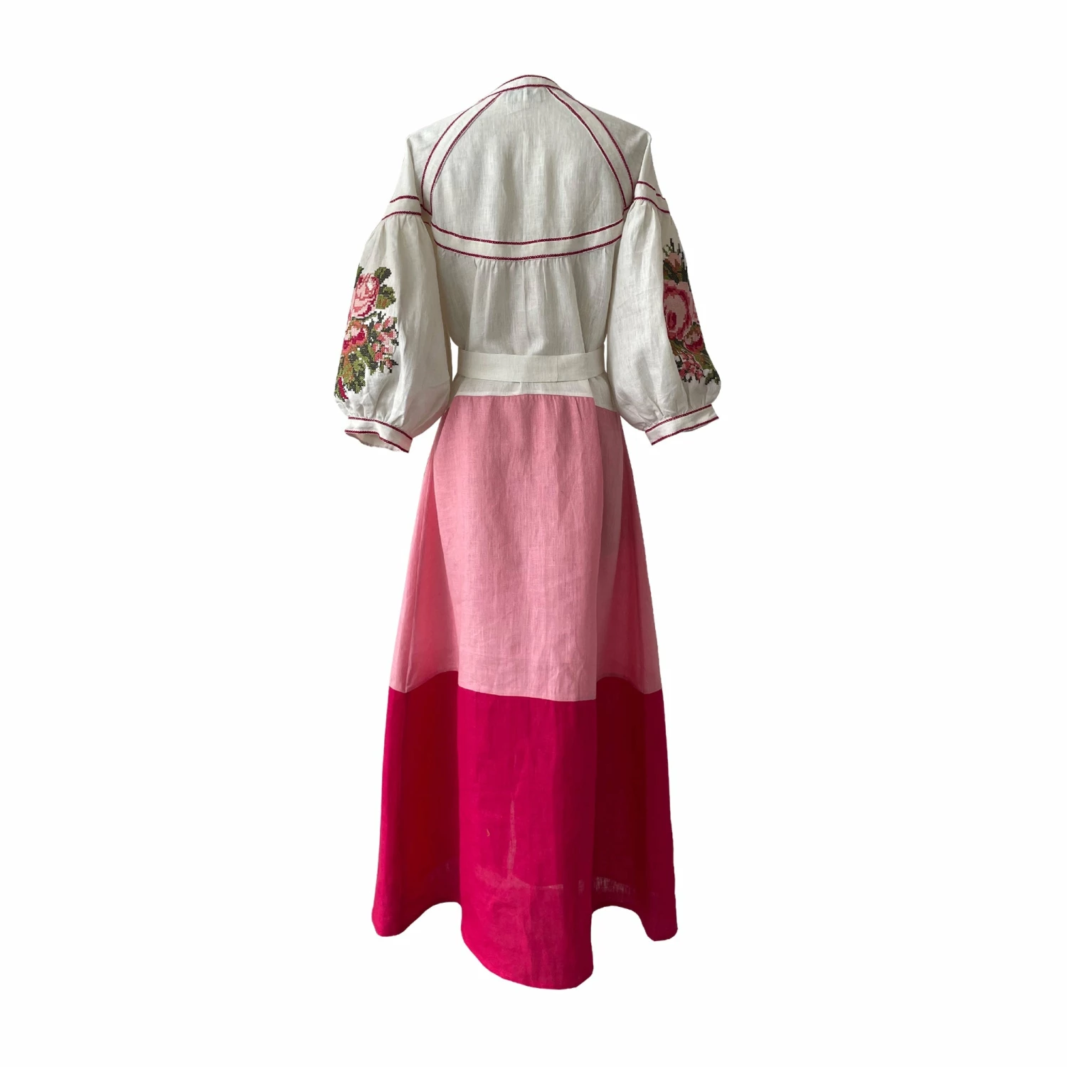 This colour-block  dress is made from handwoven linen in the south of India. It features floral cross stitch embroidery and a belt.