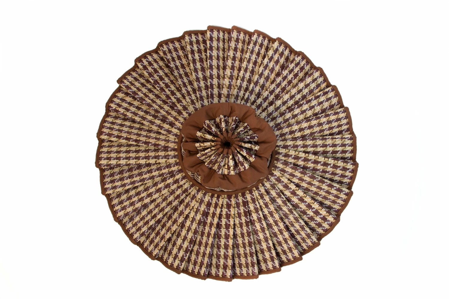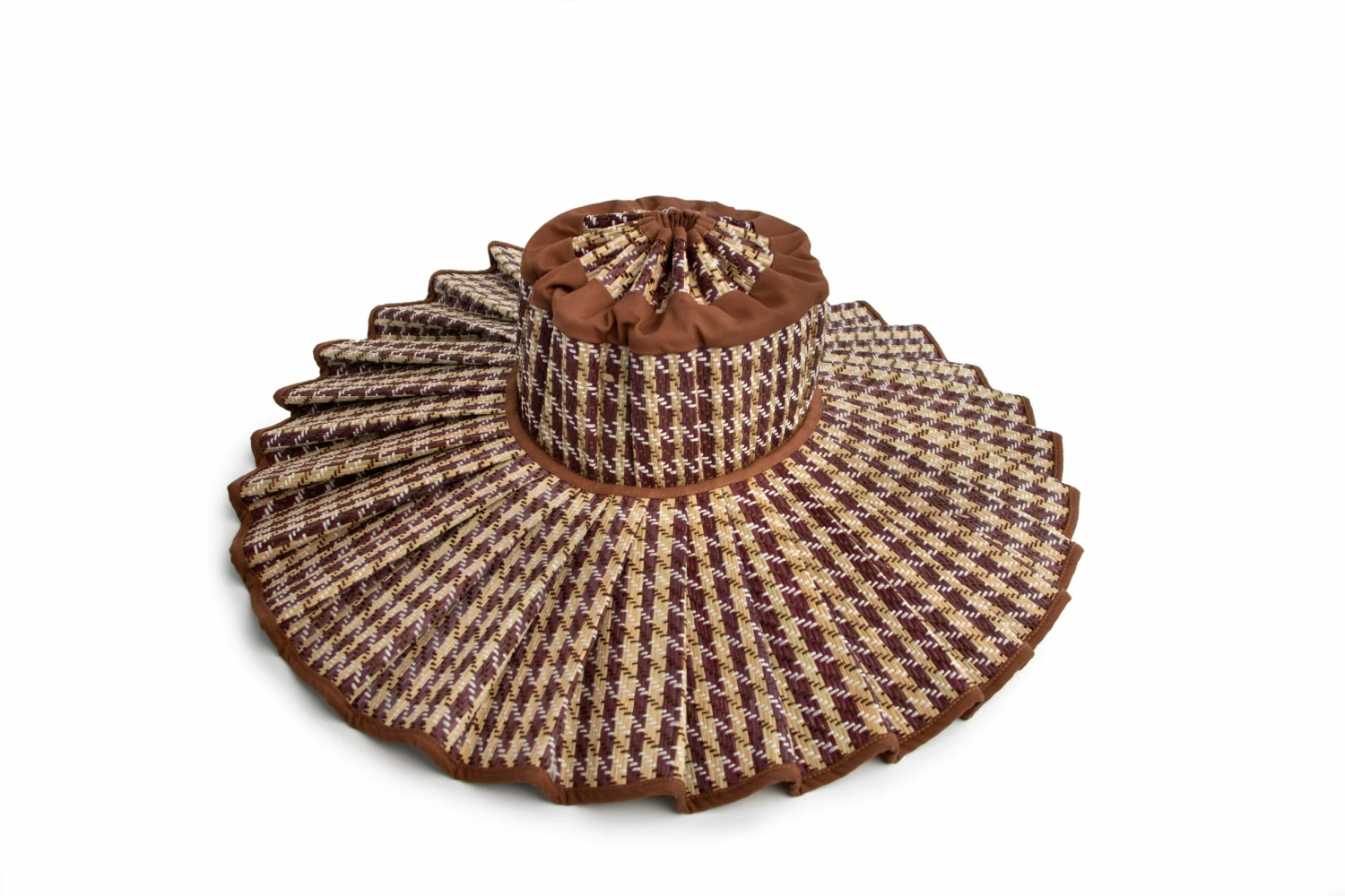 Mozambique features white and dark-chocolate coloured alternating threads woven through its striped natural and chocolate coloured hand-dyed fibre base, with a milk-chocolate brown fabric trimming and a houndstooth inspired check pattern.