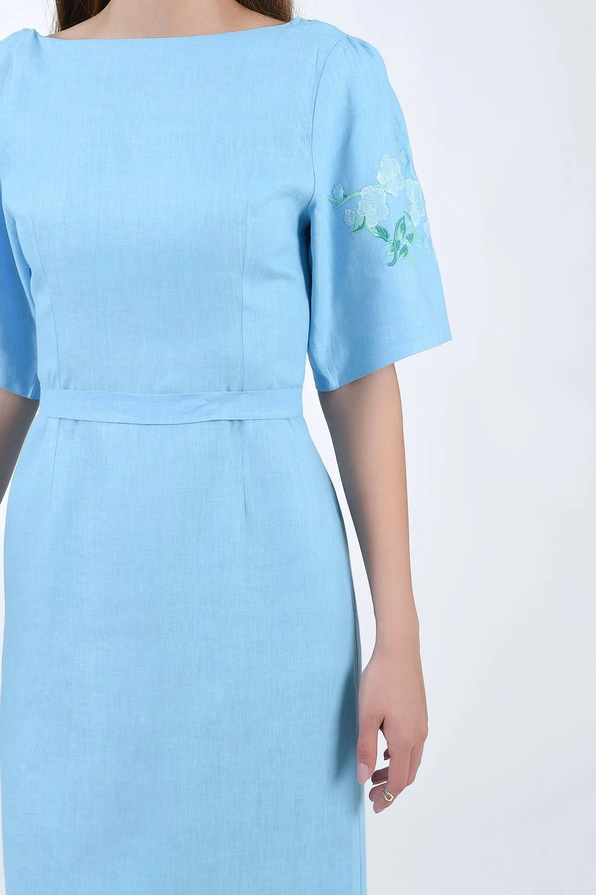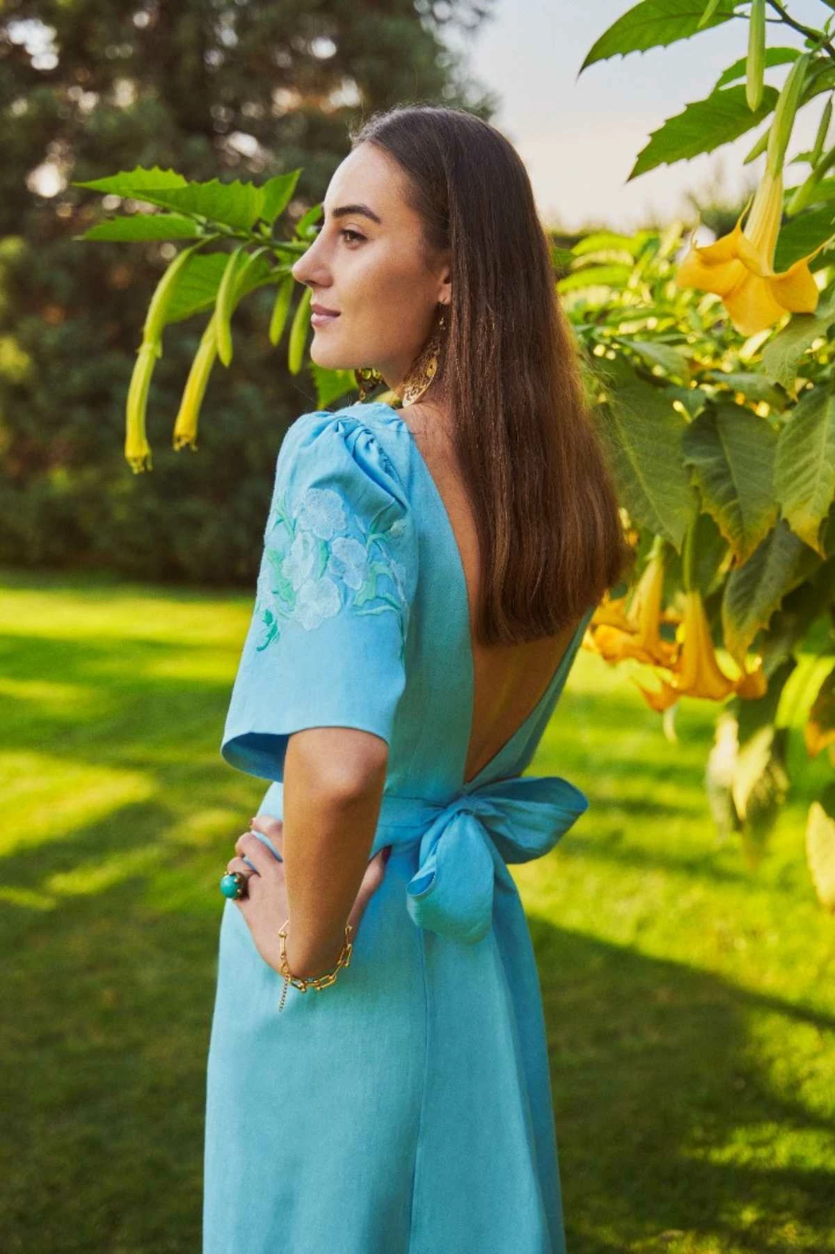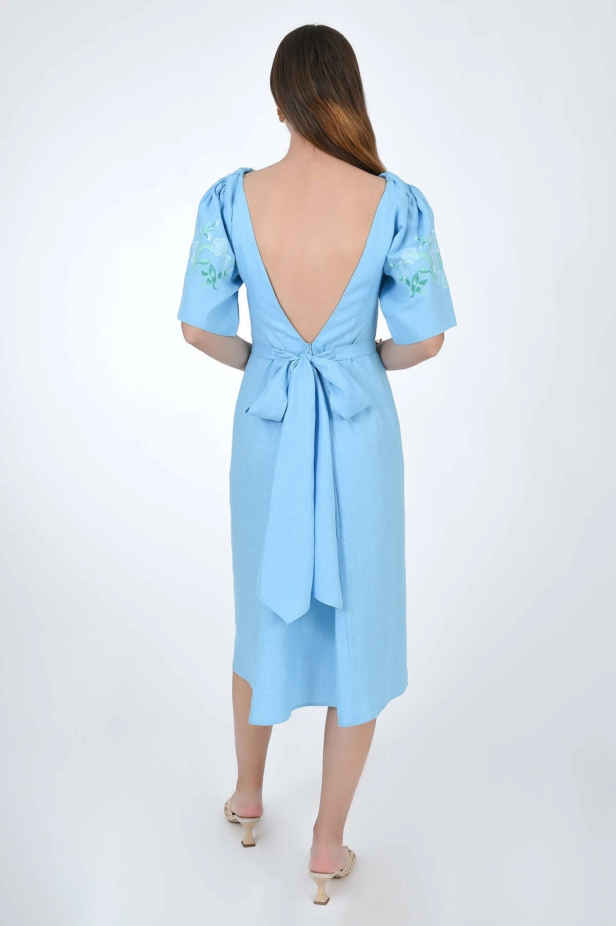 This Midi Linen Dress is the epitome of style, perfect for a special occasion or just an everyday look. Featuring a boat neckline, short sleeves, and floral embroidery detail, with a deep V open back and belt that ties into a charming bow.
