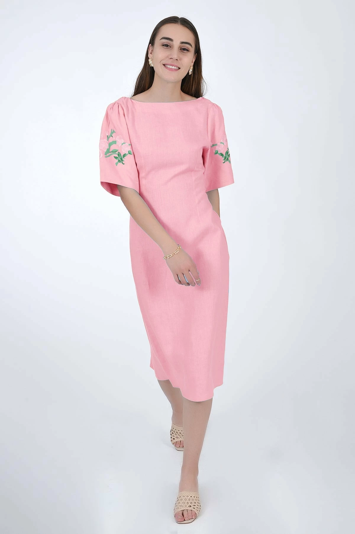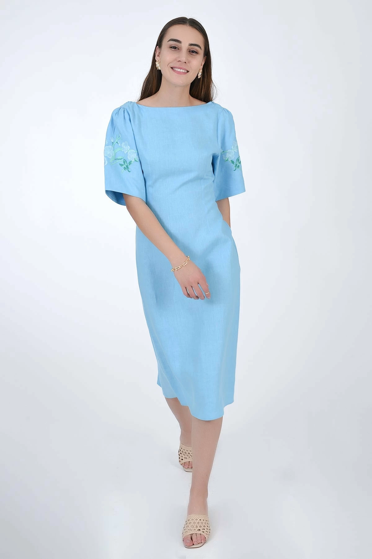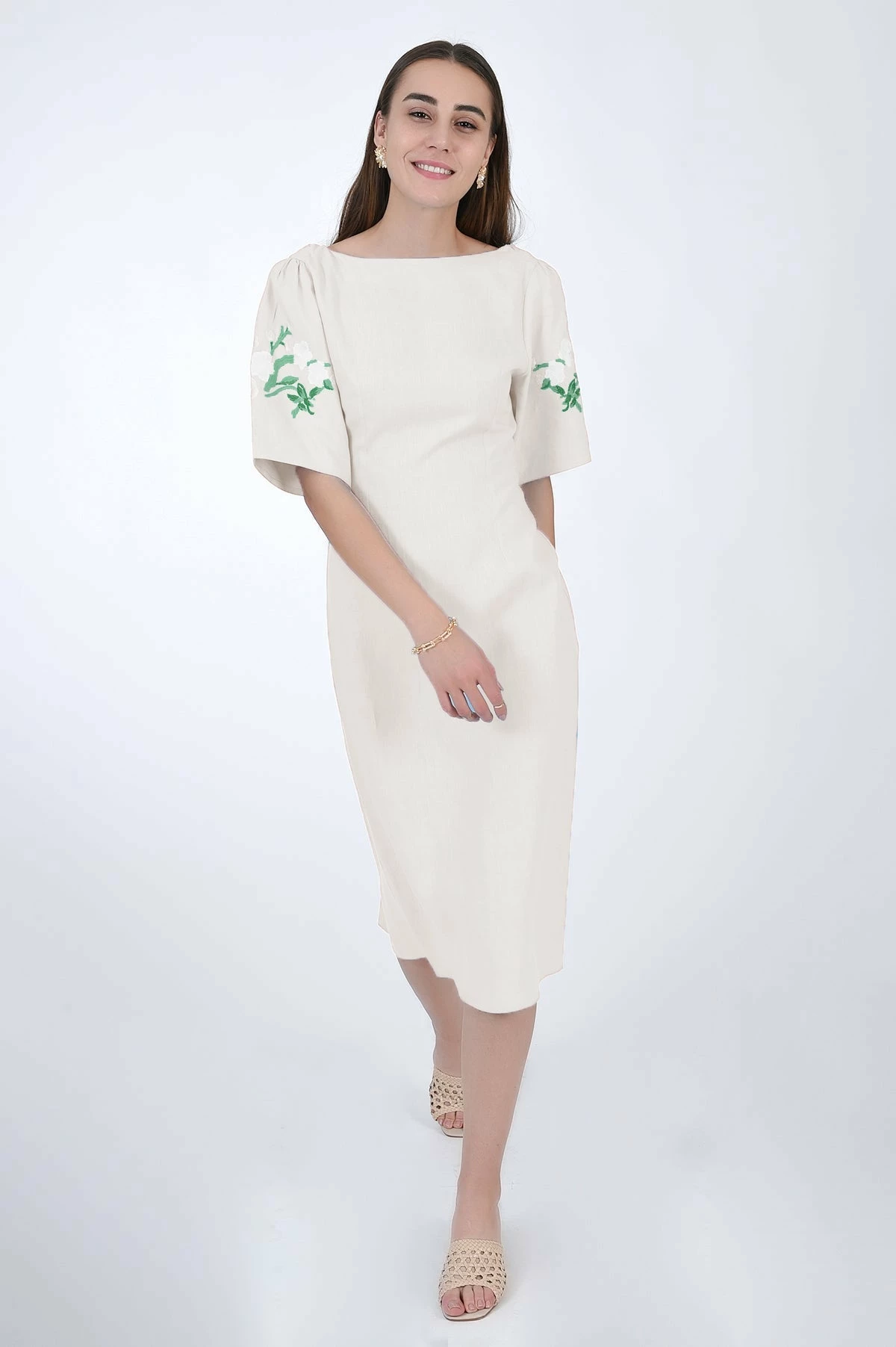This Midi Linen Dress is the epitome of style, perfect for a special occasion or just an everyday look. Featuring a boat neckline, short sleeves, and floral embroidery detail, with a deep V open back and belt that ties into a charming bow.