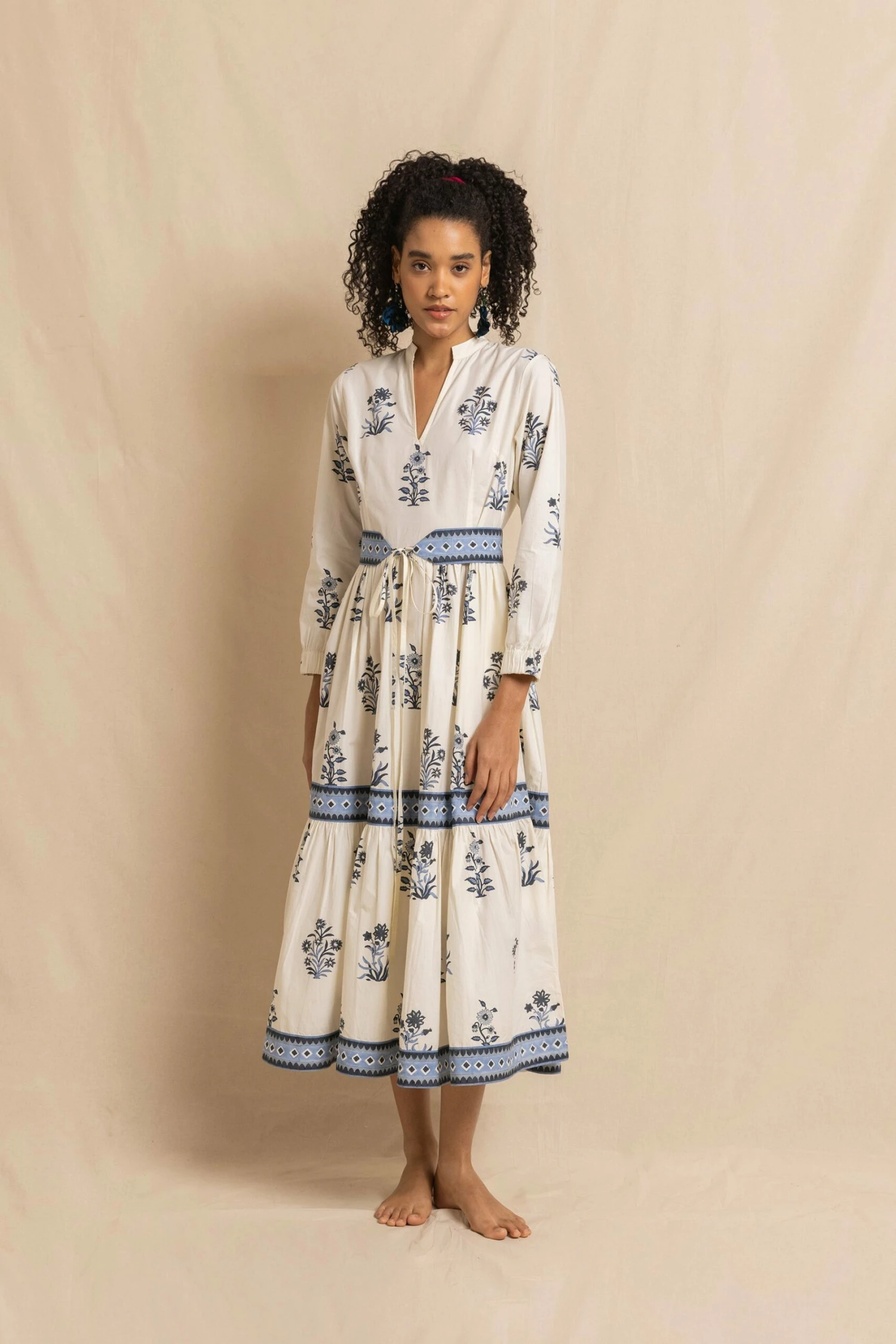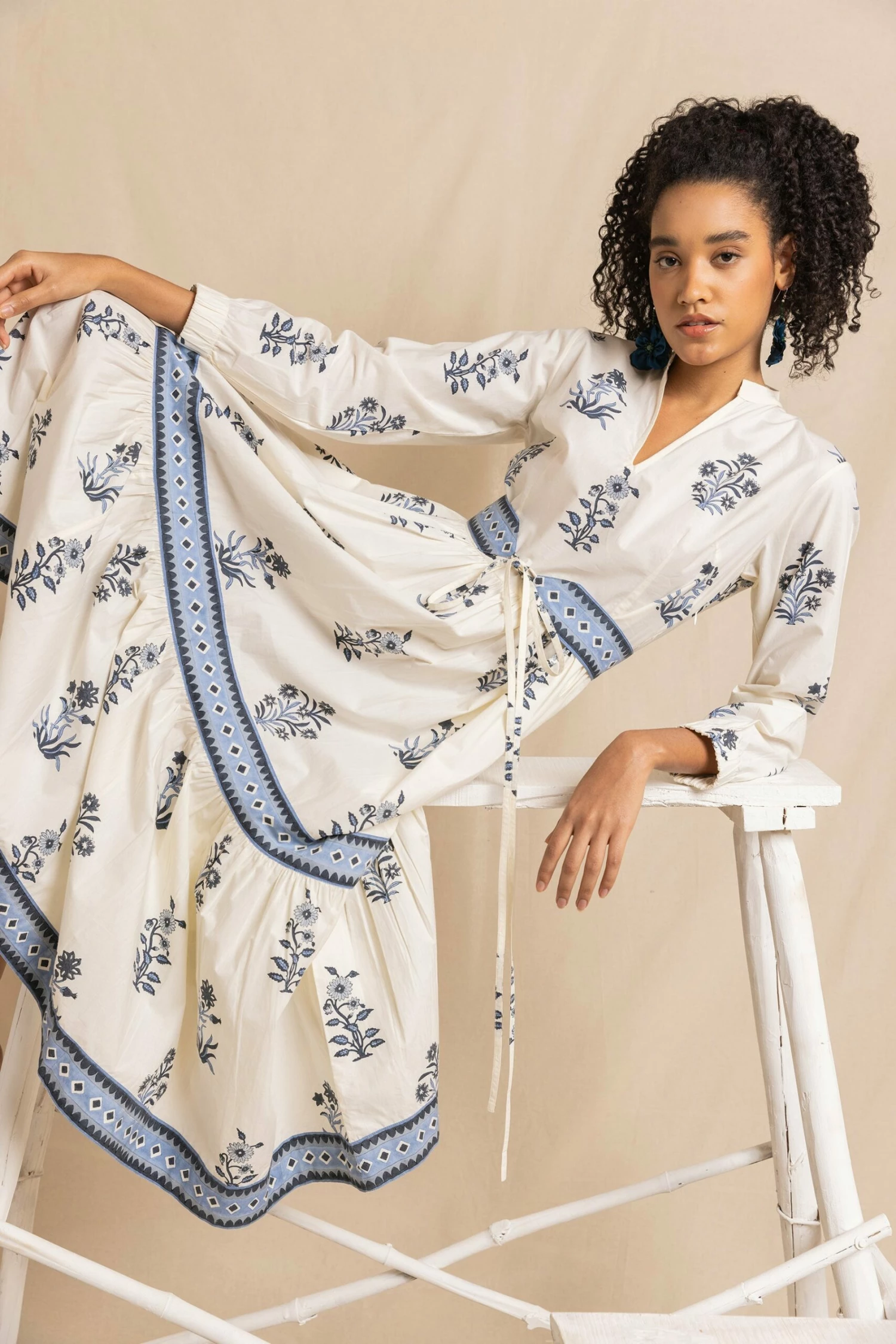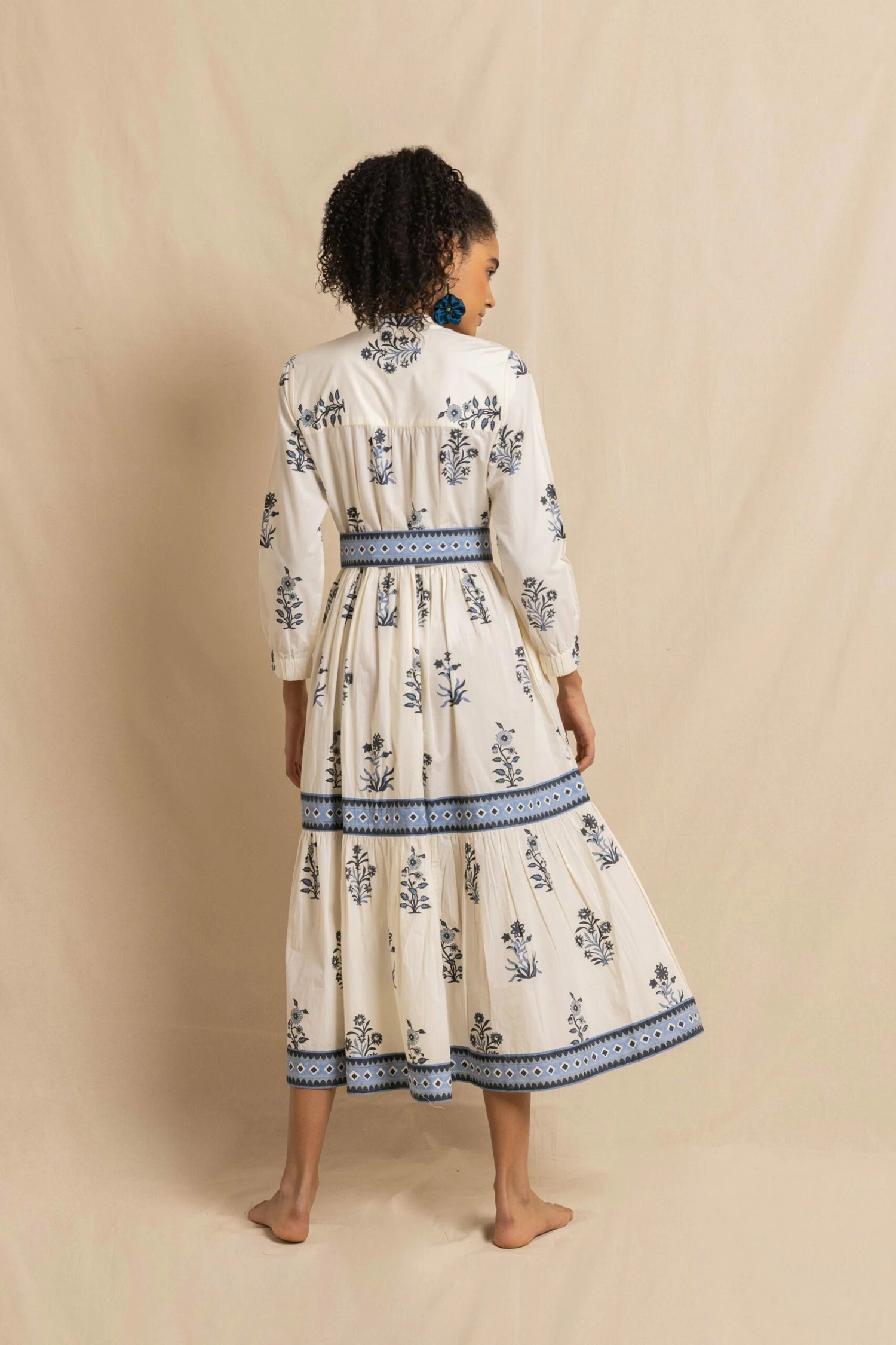 The Nancy is a classic cut; full skirted and a little more fitted on the waist and chest. This style comes with one of our new tie-back belts and is cut from cotton poplin