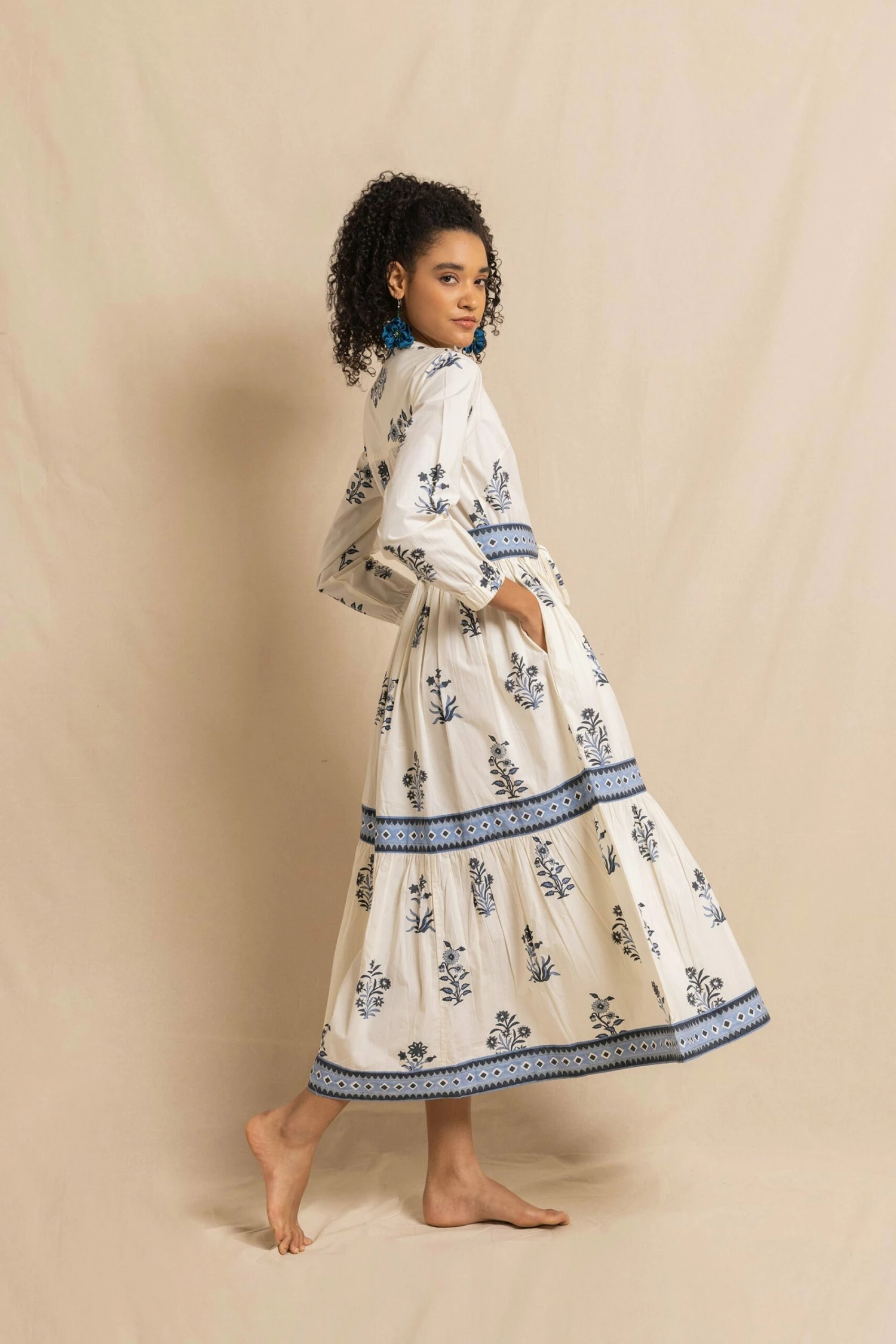 The Nancy dress closes with a side zip and has elastic cuffs that look great pulled back up or worn down. This dress has pockets.