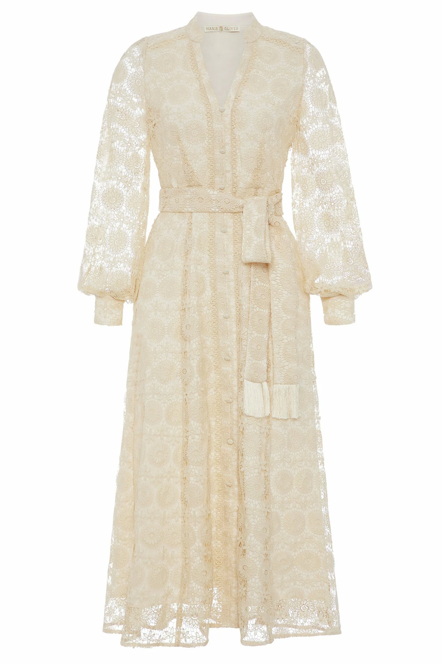 Priscilla speaks to a range of tastes and styles, where classic shirt dress lines meet bohemian elegance courtesy of a gorgeous floral lace and a fringe-edged sash belt. Fully lined, Priscilla is a great addition to your wedding trousseau.