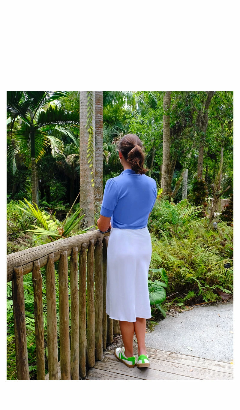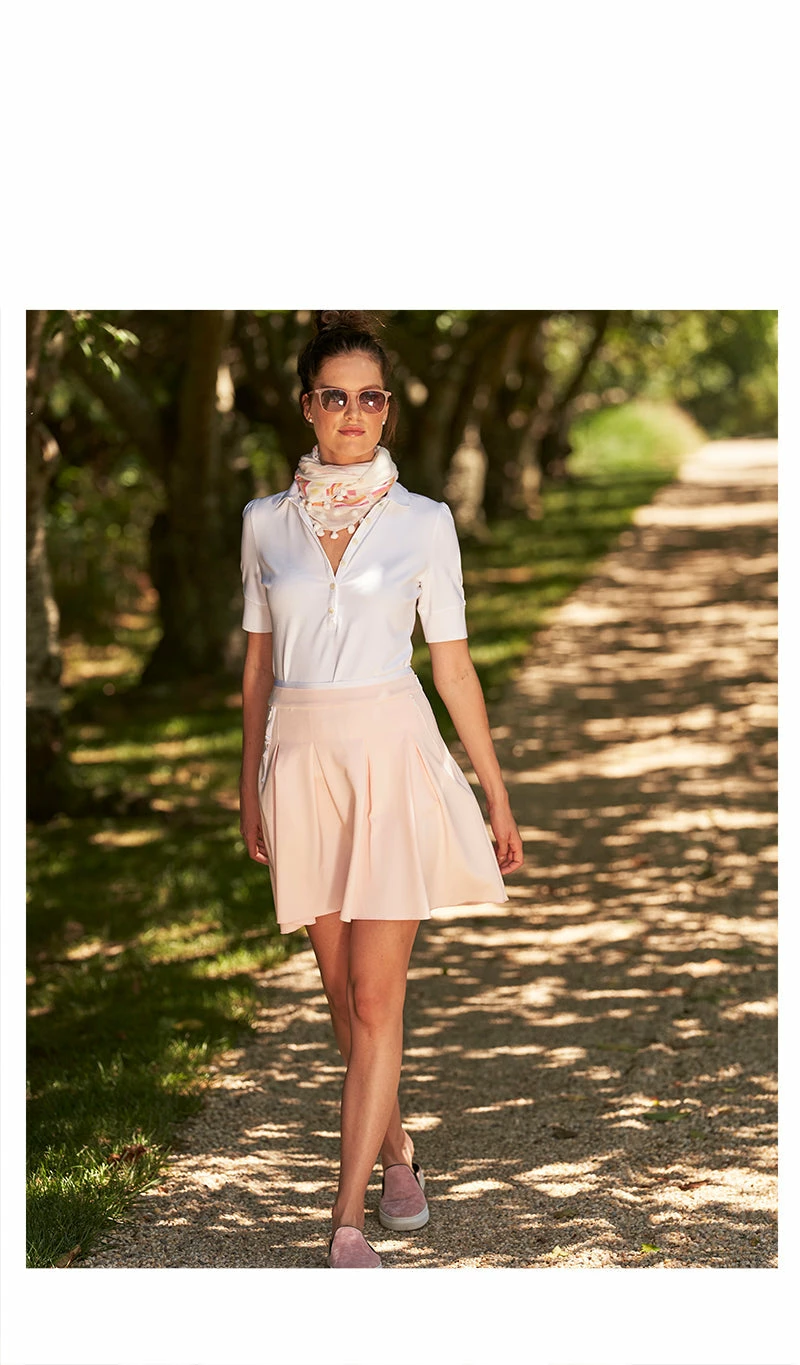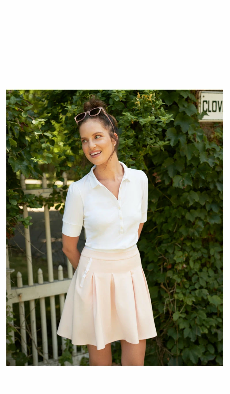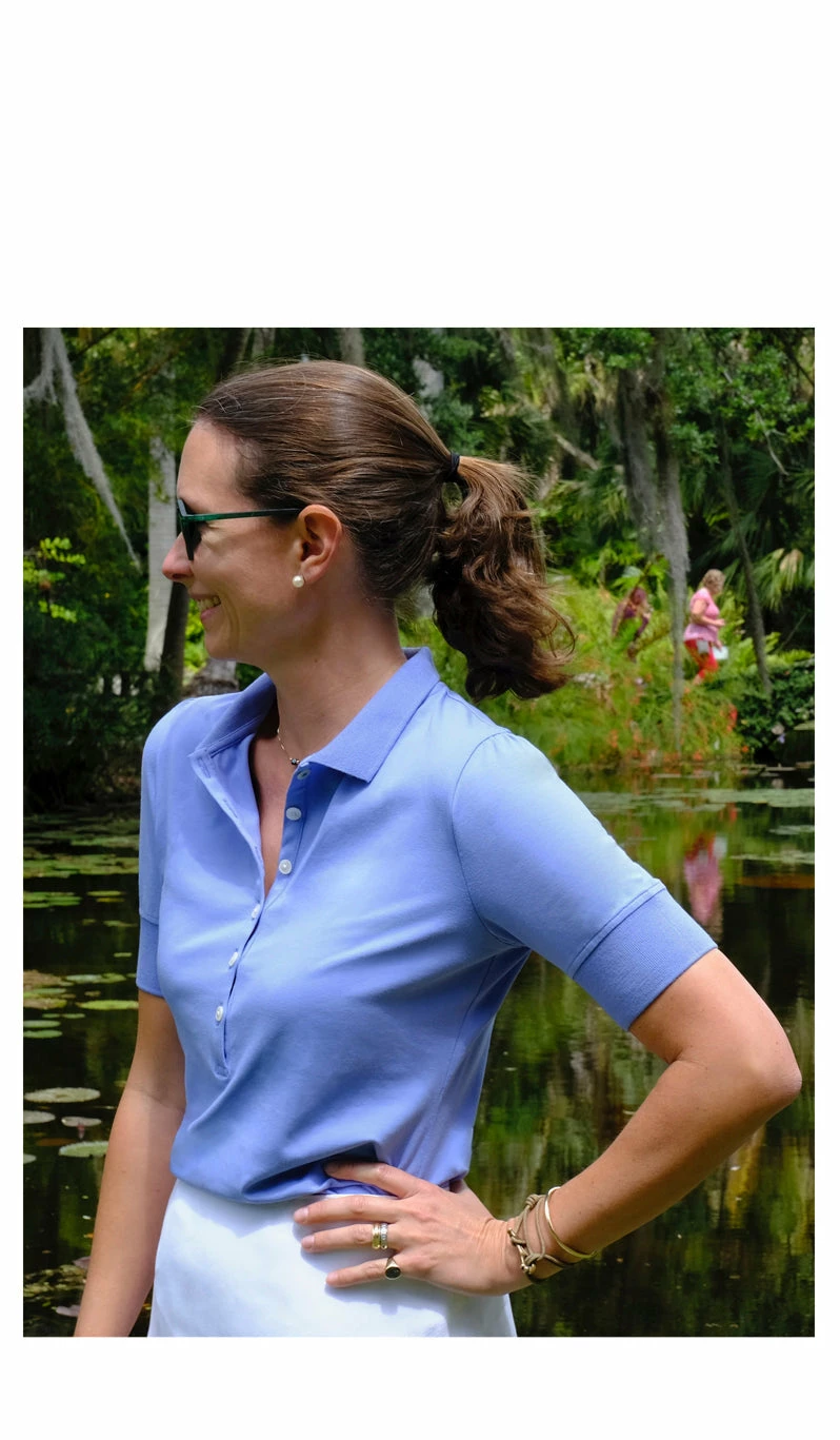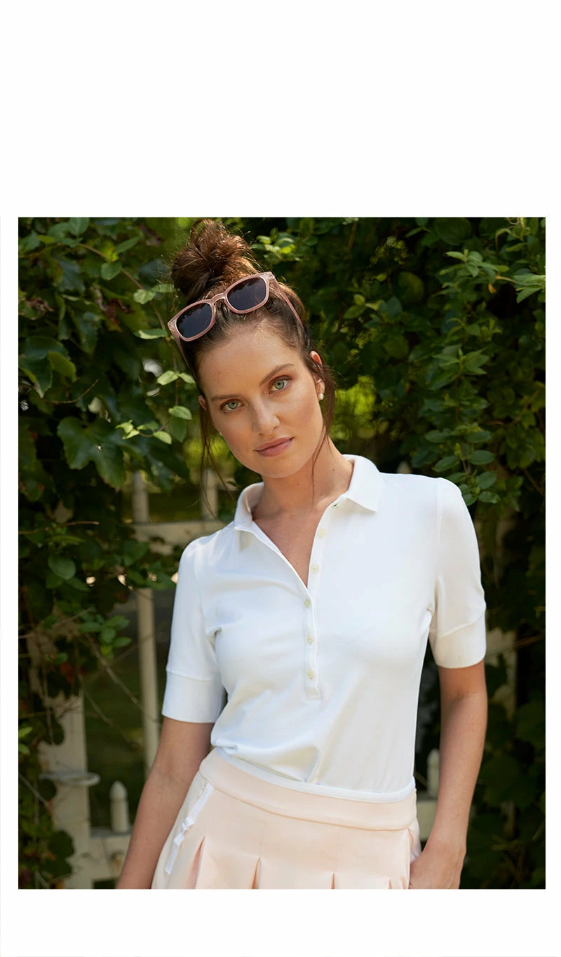 The softest, most elegant polo created thus far. The Sable has an extended narrow placard with petite buttons. The Juliette has longer sleeves than your average polo and a lengthened cuff which visually and functionally slims the arm. The Sable silhouette is fitted with an hourglass shape for femininity unlike all the boxy polos you’ve had. This promises to be a shirt you want to live in, play in all while looking glamorous.