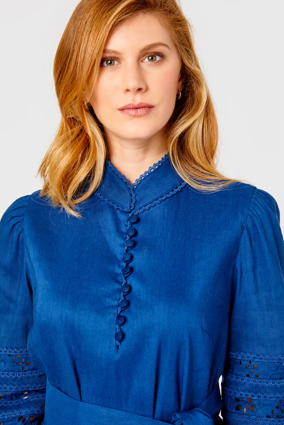 Seen in British Vogue, our favorite dress of the season and sure to be yours too. The Sarah dress is inspired by Bridgette Bardot’s yachting style in the 60s. This lux French stretch linen fabric is the perfect weight for the spring and summer seasons. Covered buttons and button loops with lace trim along the placket and around the collar. Cotton embroidered eyelet trim with top stitched trim inserts on the bell sleeves and hem. This slight A-line silhouette comes with a wide self-fabric belt. Designed and sewn in Los Angeles.