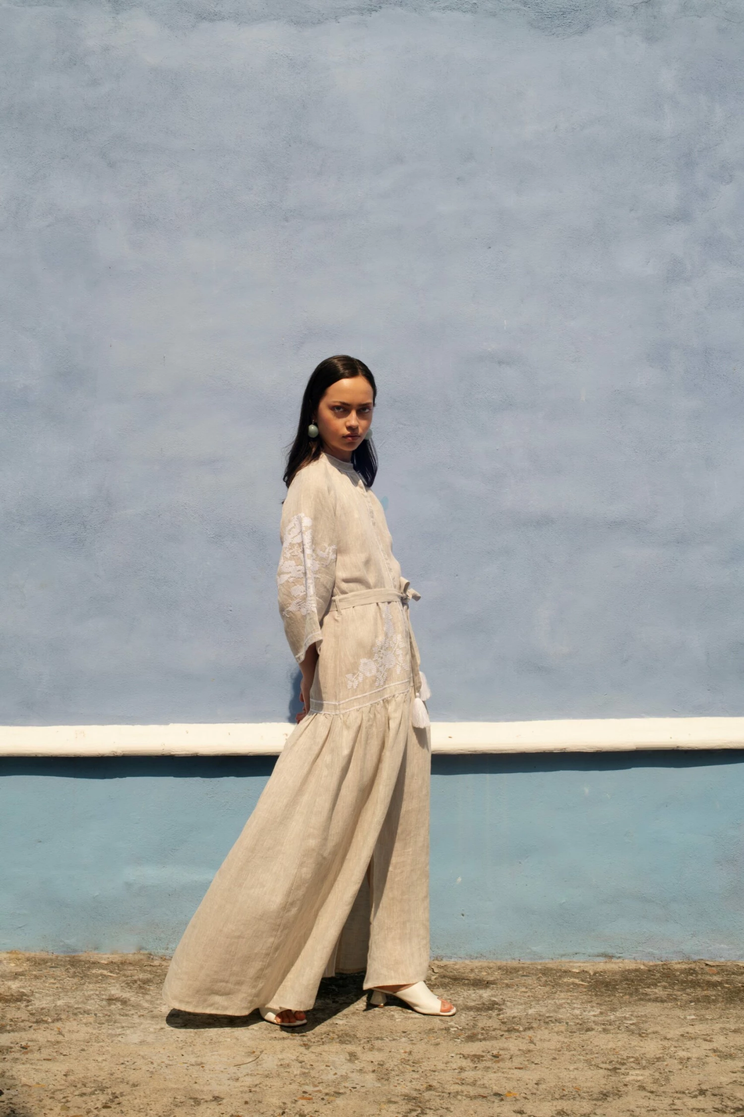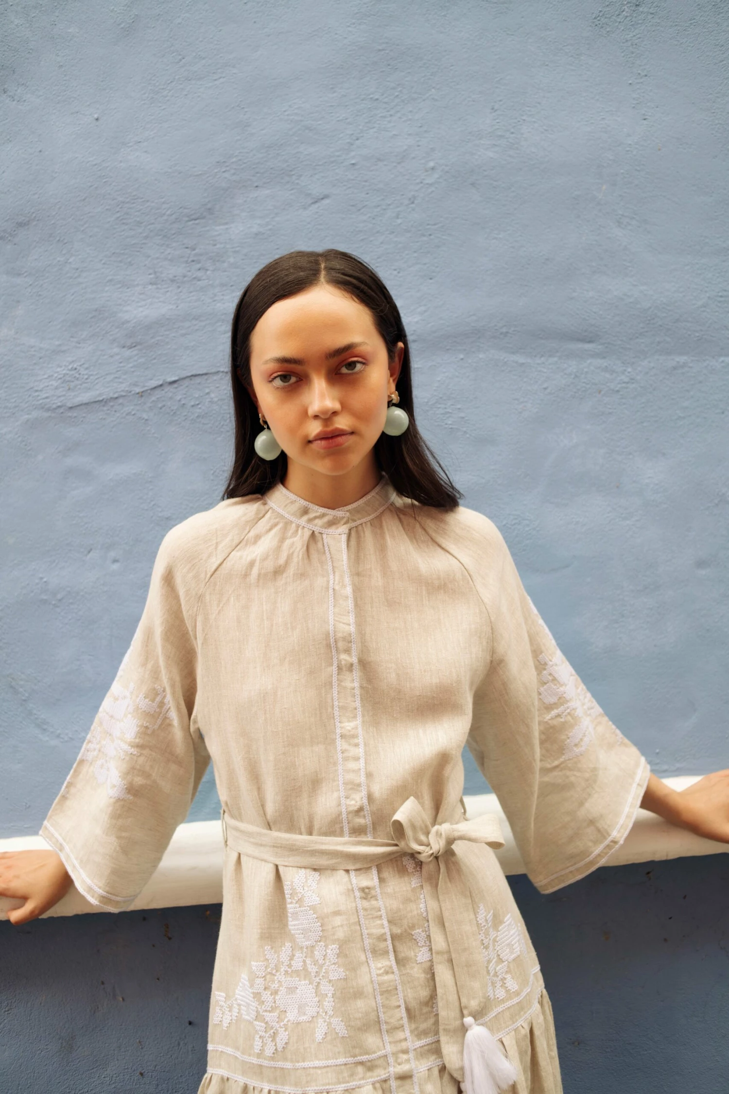 The Swan is made in natural coloured linen from the South of India. It features white embroidery, hidden front buttons, bell shaped raglan sleeves and tasseled belt.