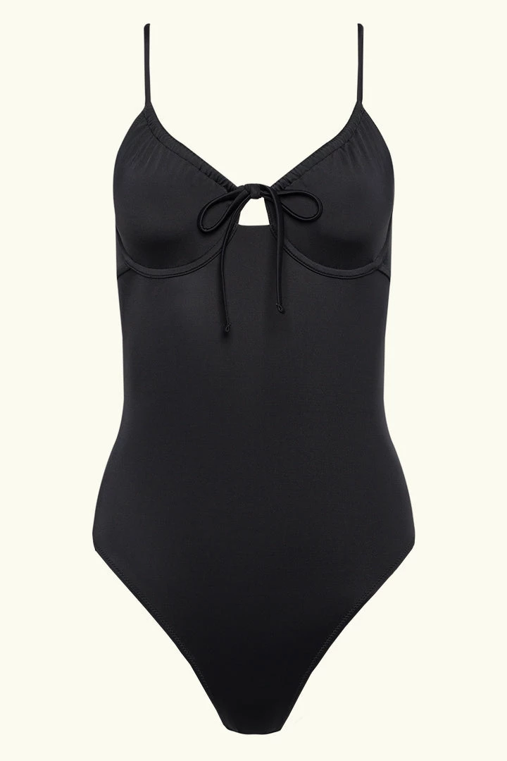 Designed with underwires for support, the silhouette features adjustable spaghetti straps with a fully adjustable neckline. Complete with a high-cut leg, a moderately cut bum and an open back secured with a hook closure (and three adjustable loops).