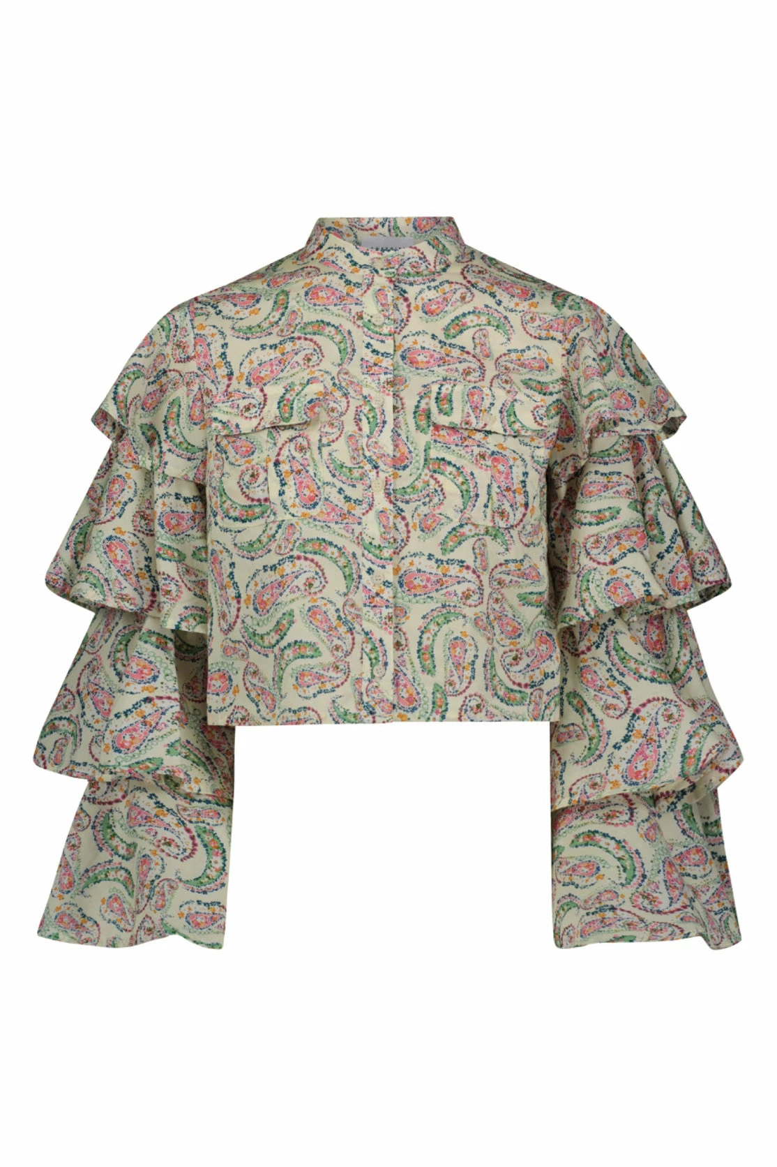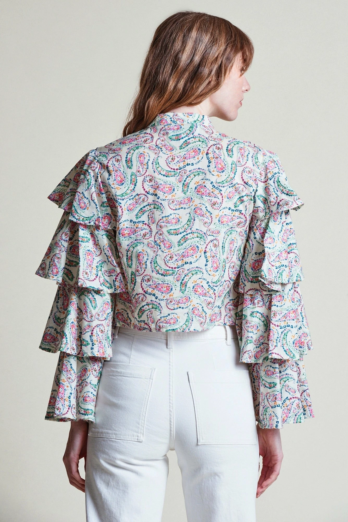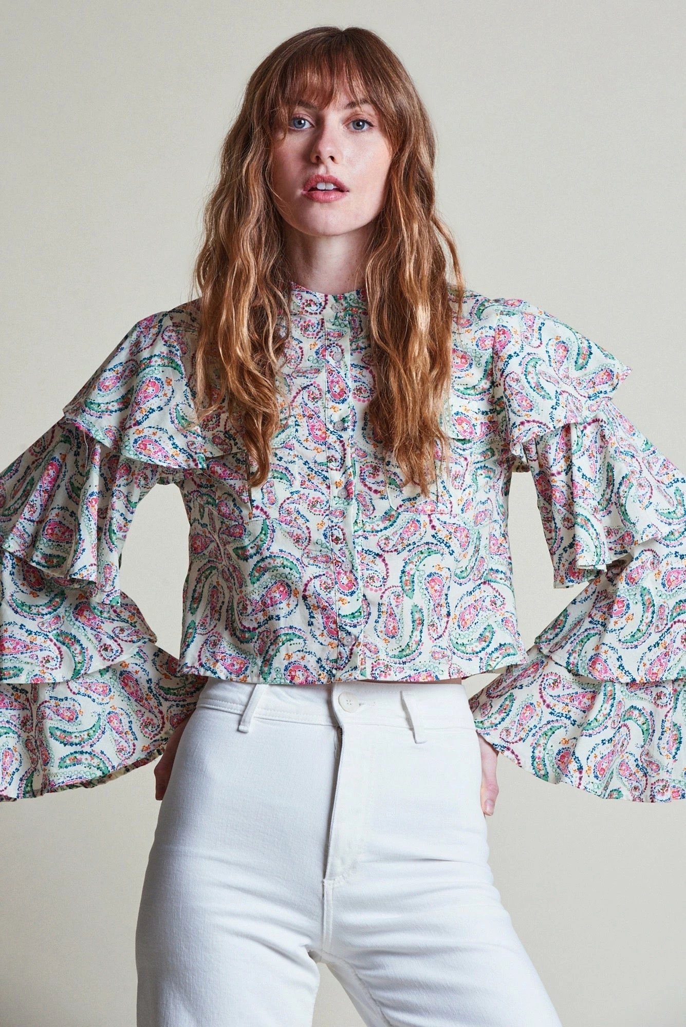 With tiered ruffled sleeves and a slightly cropped waist, we’re wearing The Karlie with high waisted bottoms for the perfect proportions.