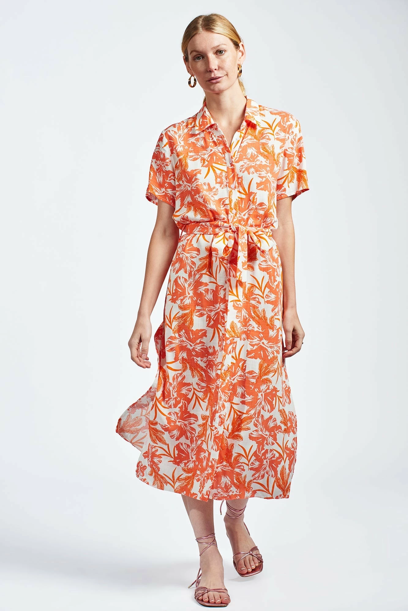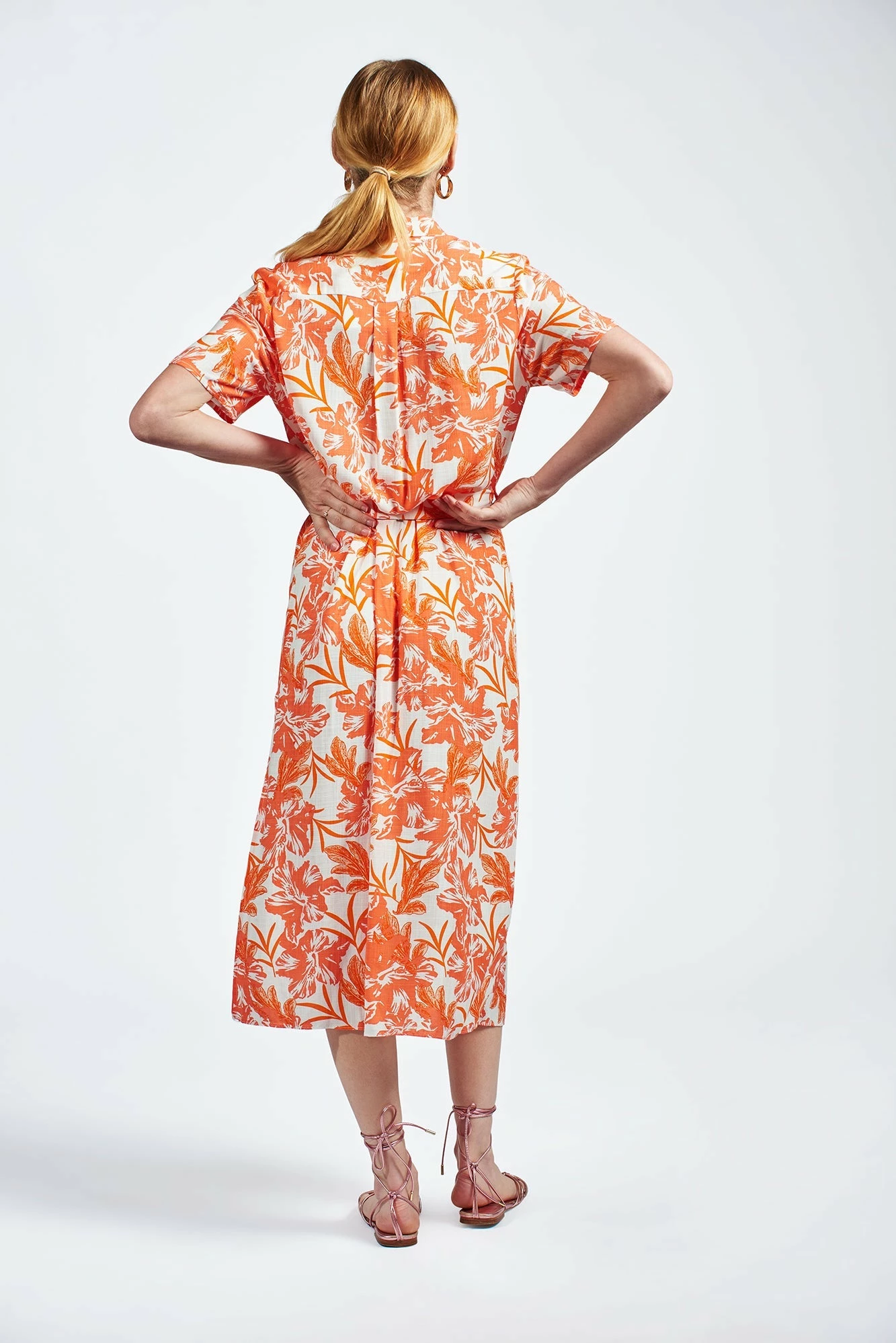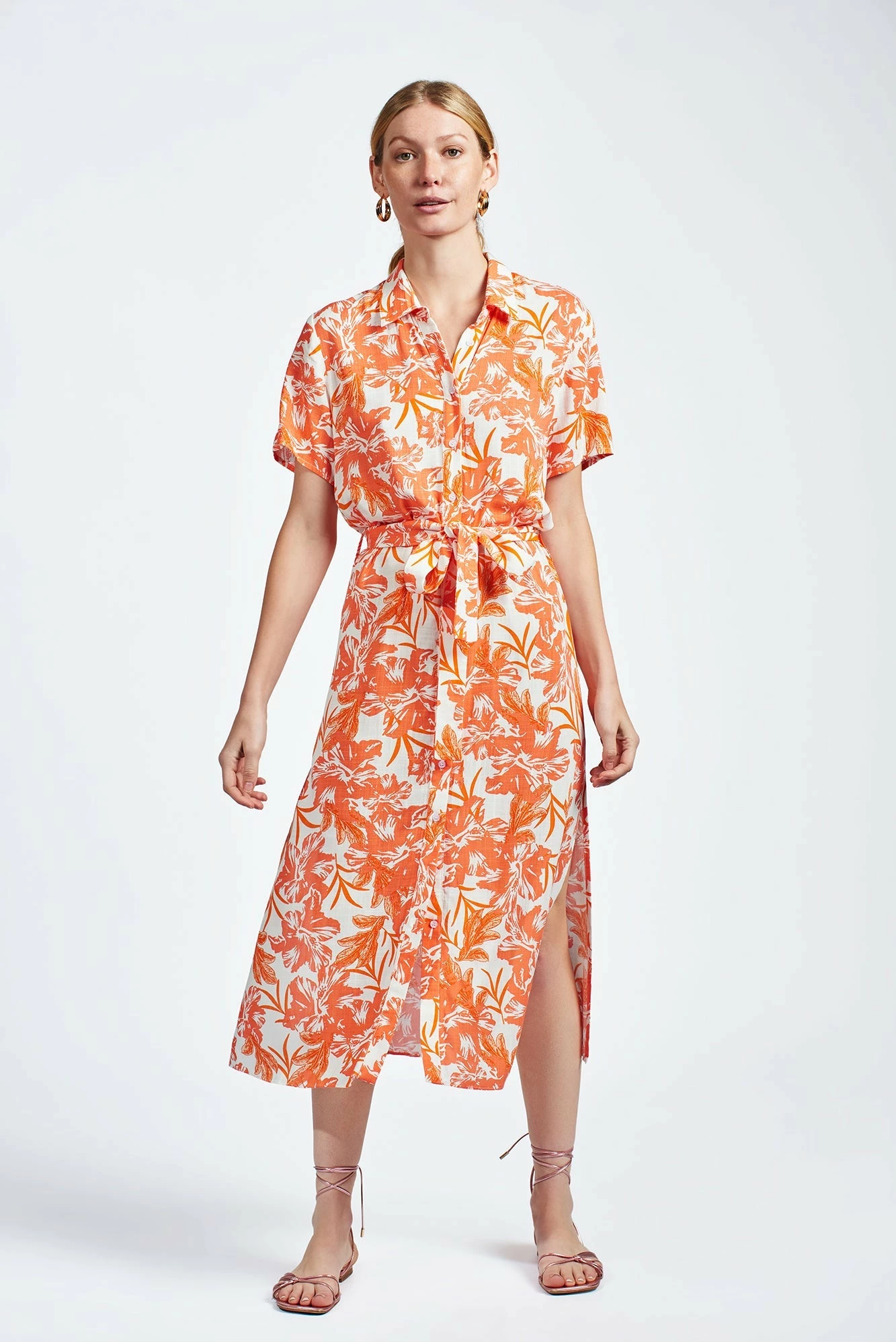 Our column dress has slightly retro office vibes, but reinvented for now. A removable belt cinches the waist. Features a tropical floral print.