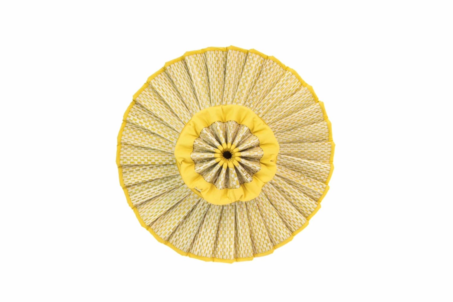 Tuscany features white-coloured thread in a basket weave, woven through its natural grass fibre base, which has been lightly hand-dyed to create a sunny yellow base, with yellow fabric trimming.