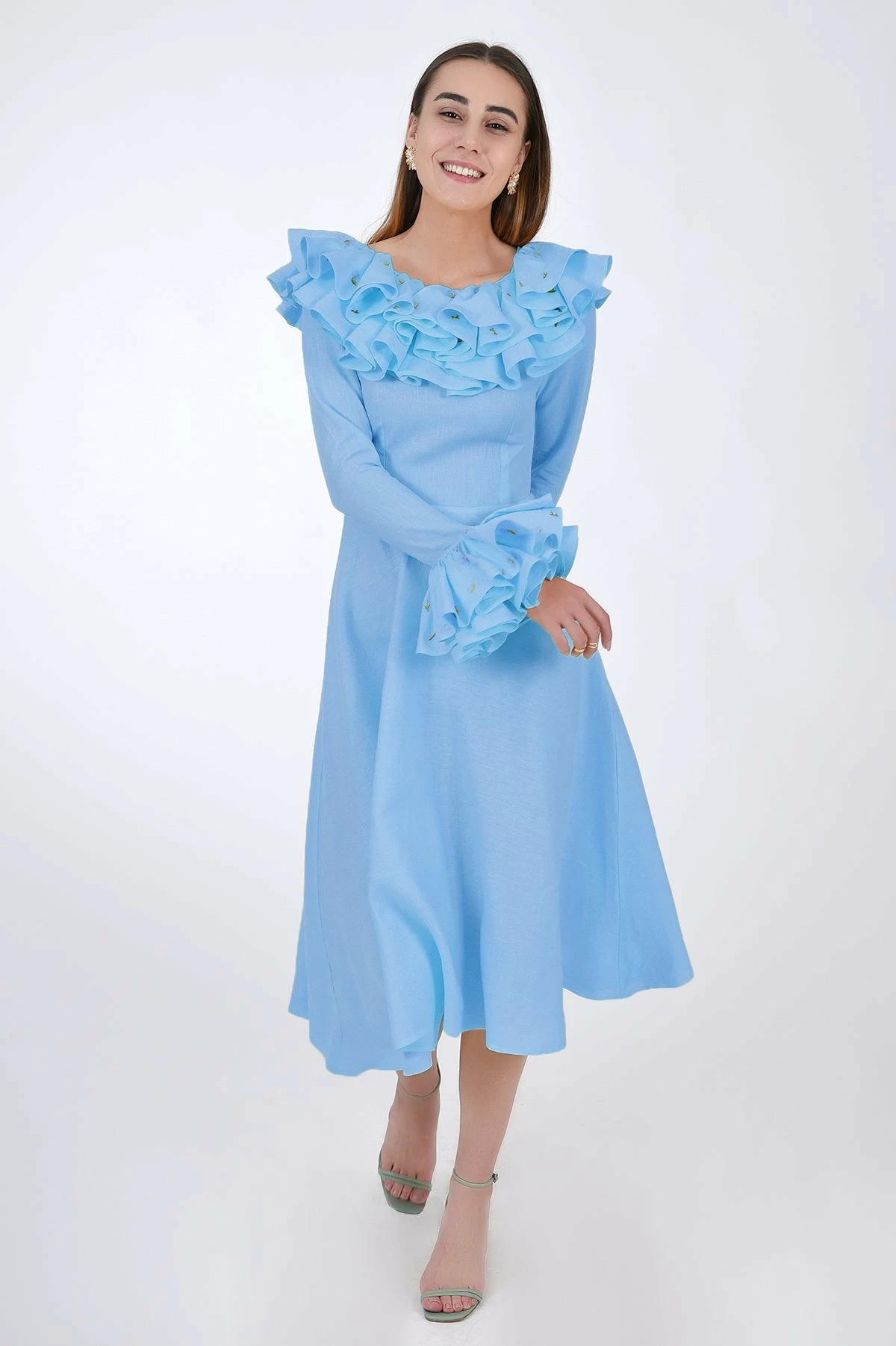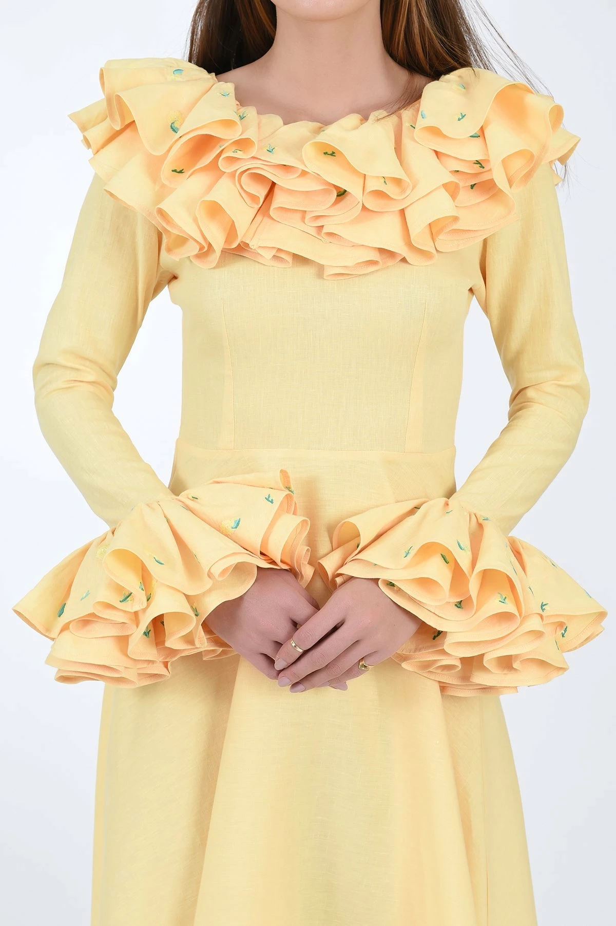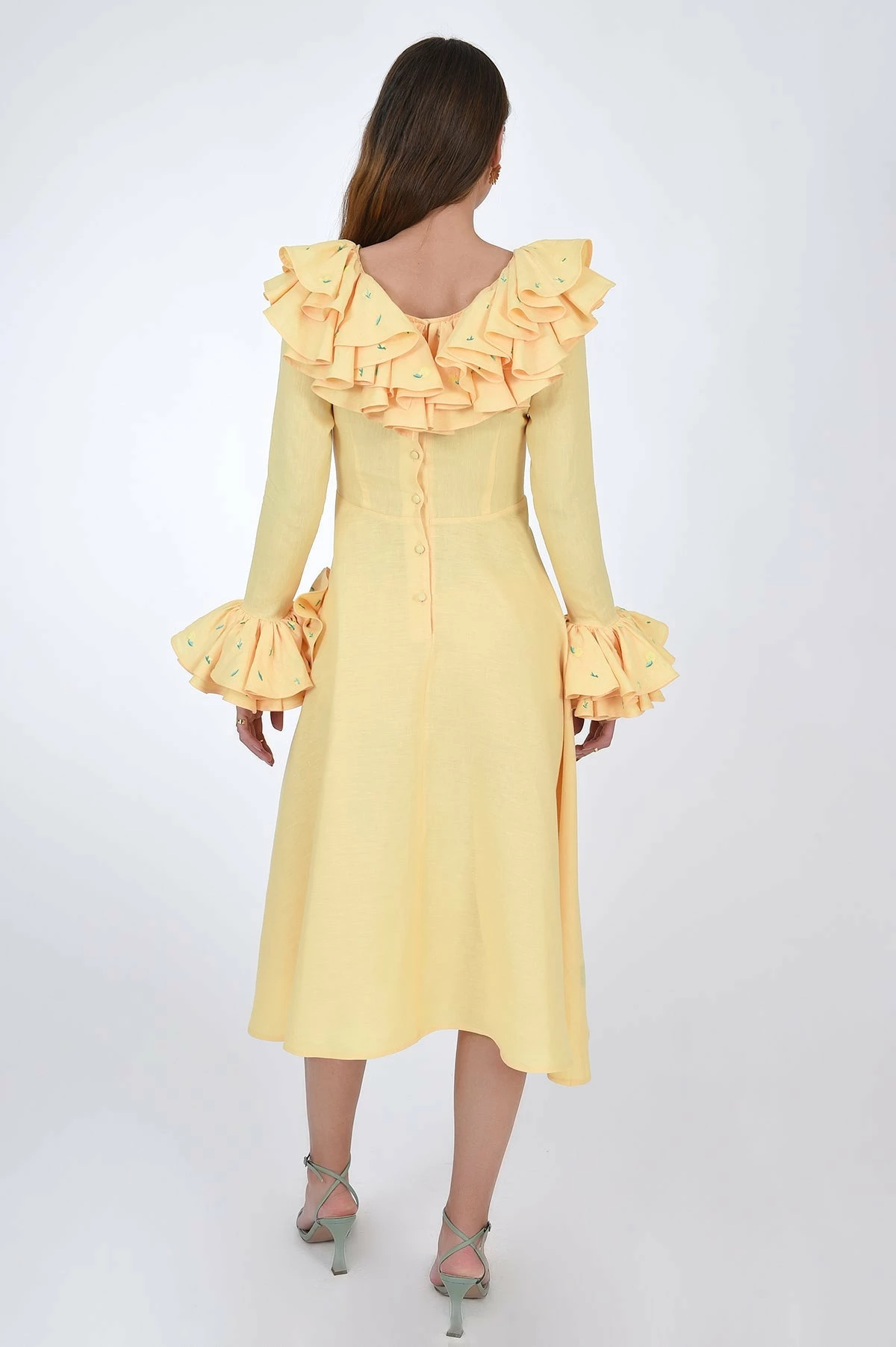 Stunning 100% linen ruffle dress. Featuring a ruffle neckline and long ruffle sleeves, this midi dress boasts a silhouette that flatters any figure. The button-back closure adds a touch of elegance and sophistication.