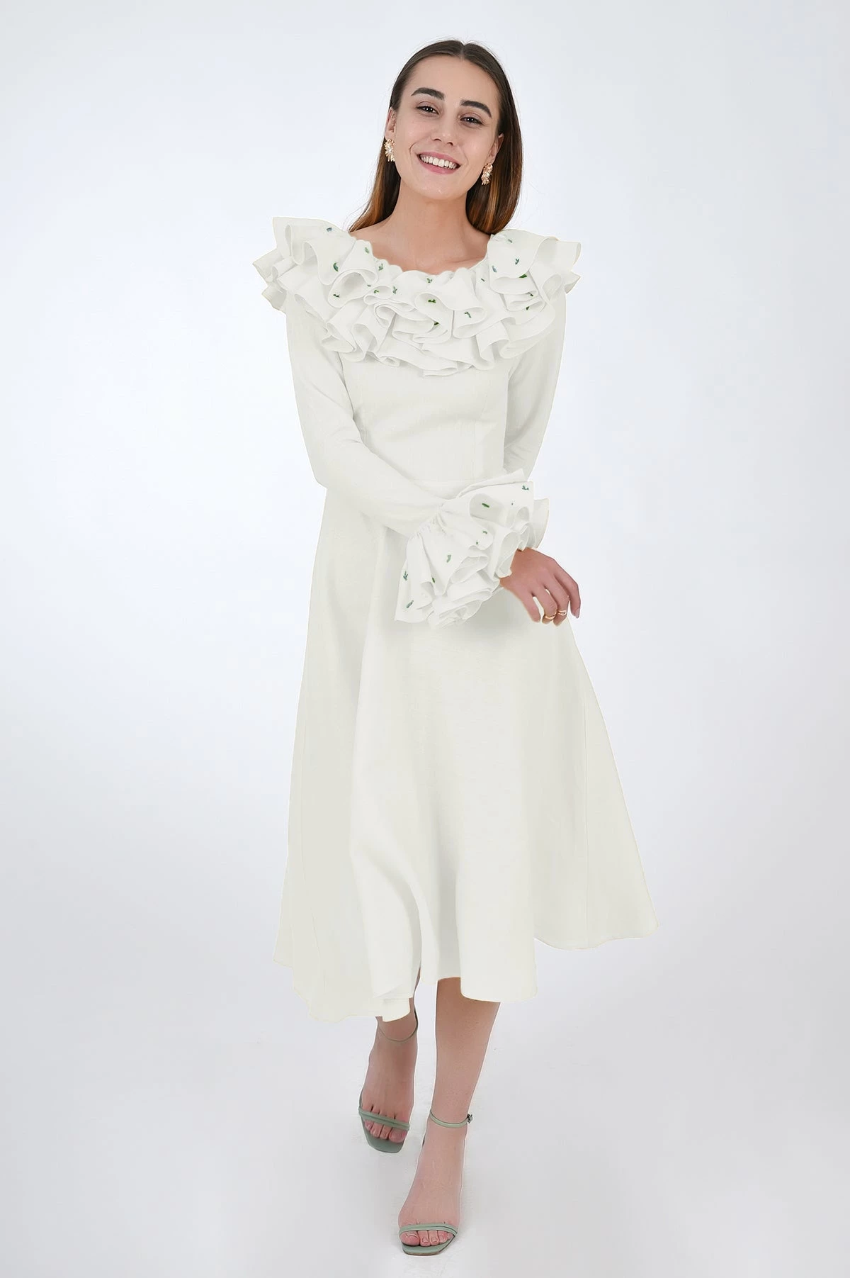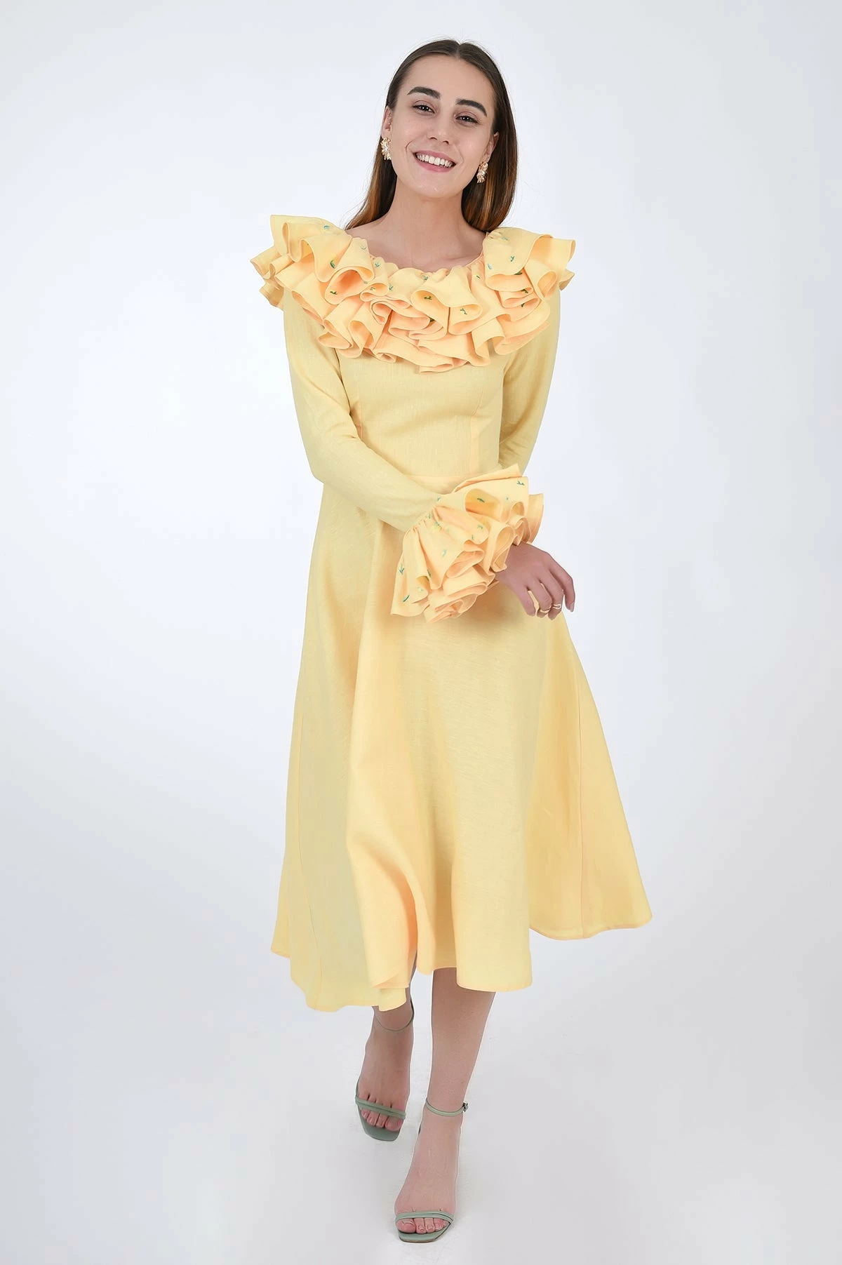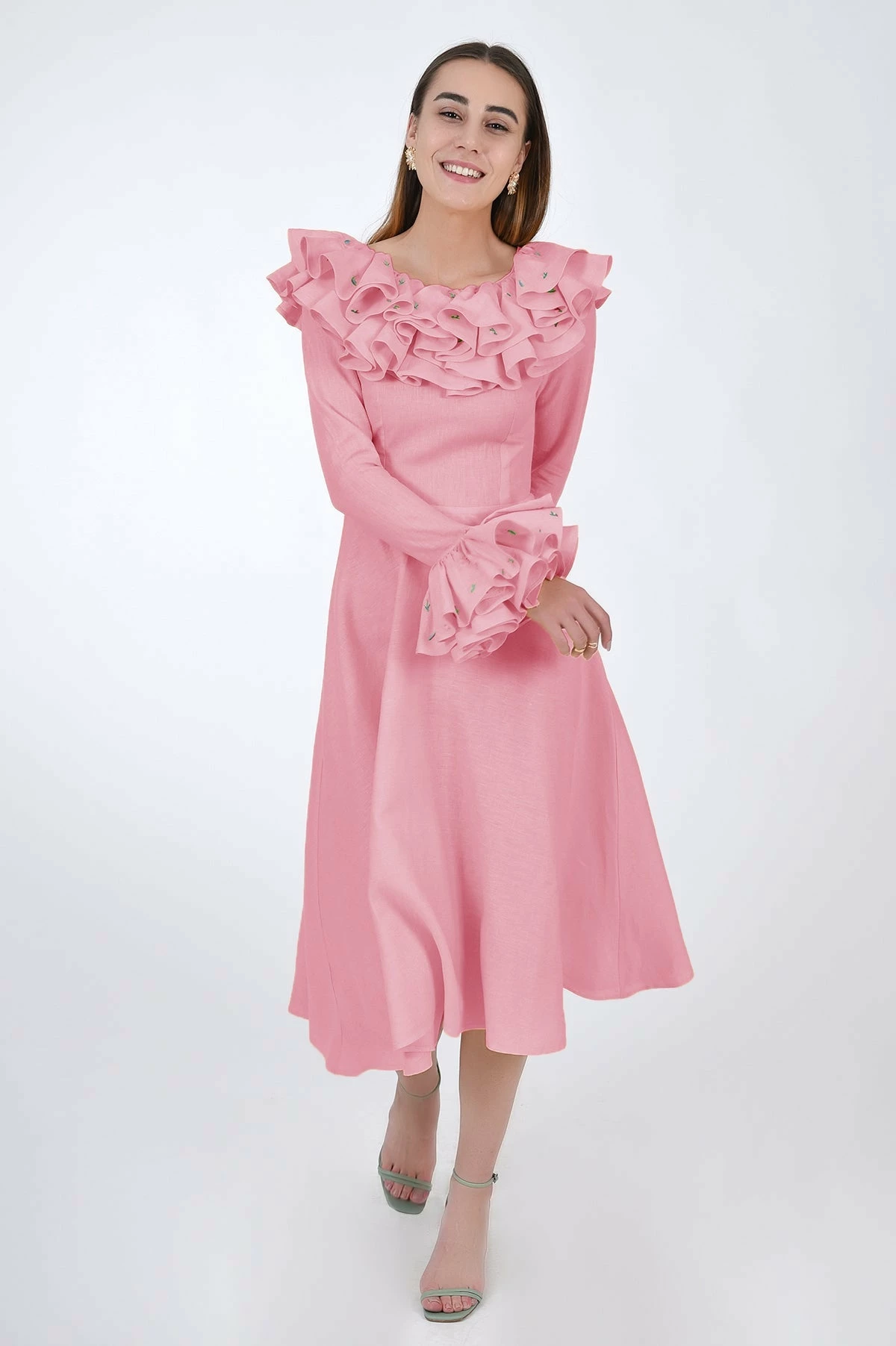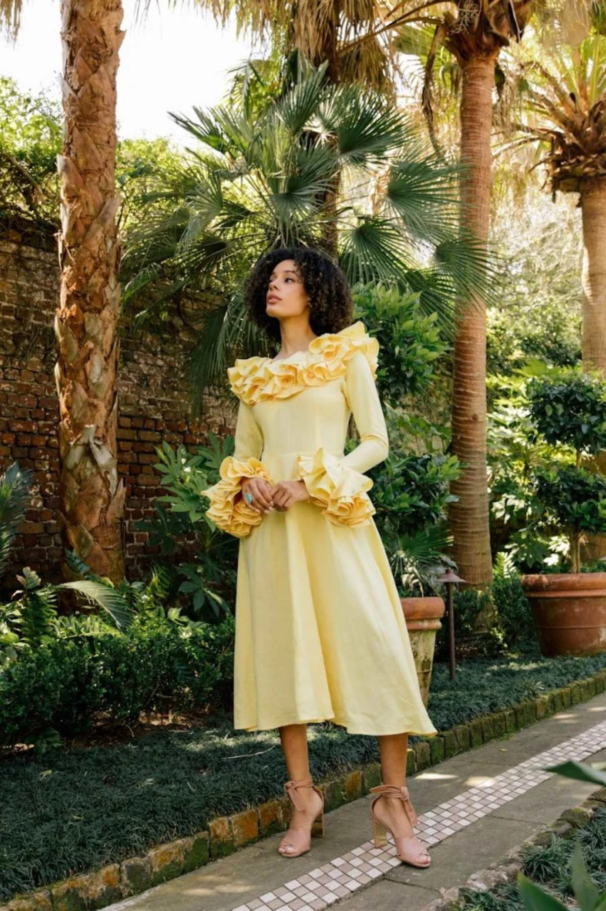 Stunning 100% linen ruffle dress. Featuring a ruffle neckline and long ruffle sleeves, this midi dress boasts a silhouette that flatters any figure. The button-back closure adds a touch of elegance and sophistication.