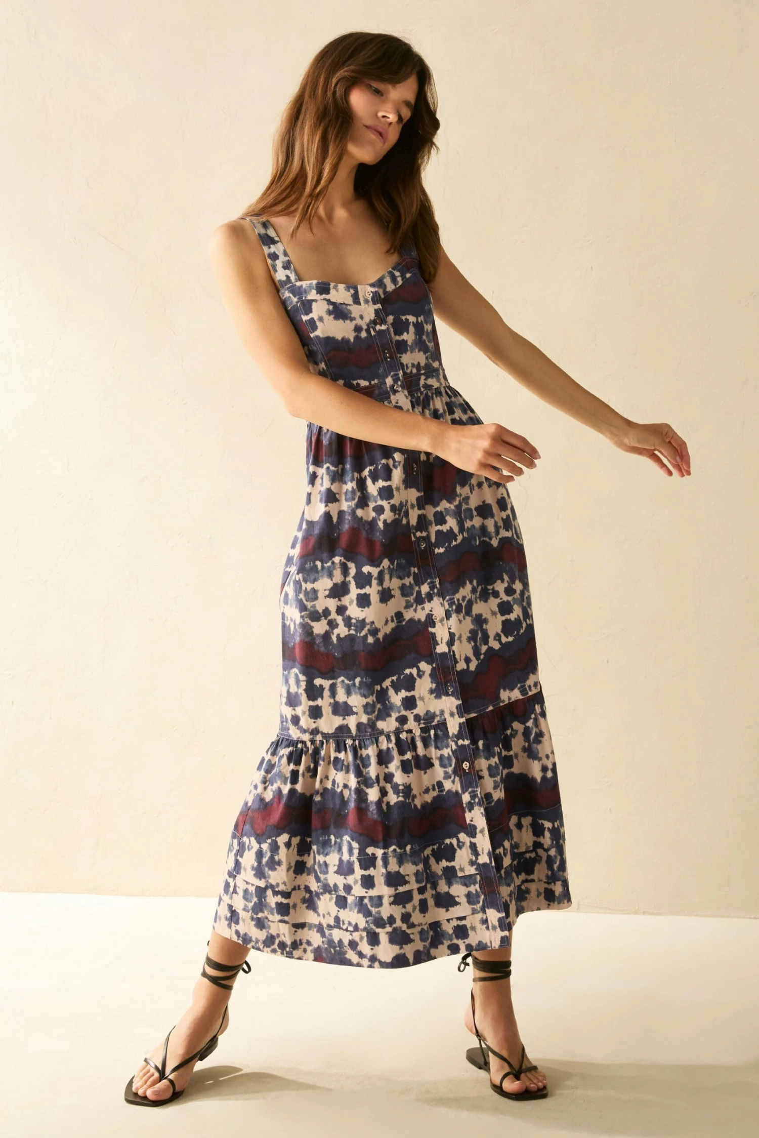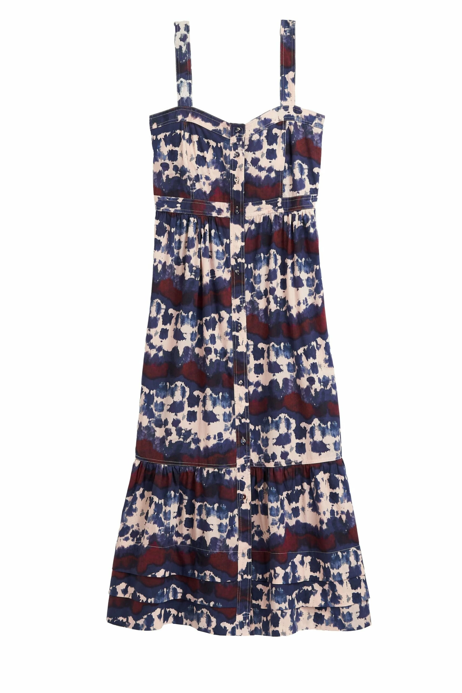 Toss on our Yara midi with sneakers and a jean jacket for a wear-right-now look. Or tuck the slip-on style, which features functional buttons down the front, adjustable straps, and smocking across the upper back, into your suitcase if youβre bound for warmer climates this fall and winter. Our new Midnight Ice Dye print adds dimension and interest to the wear-everywhere dress courtesy of the patterns organic dye effect and contrasting pastels and inky blues.